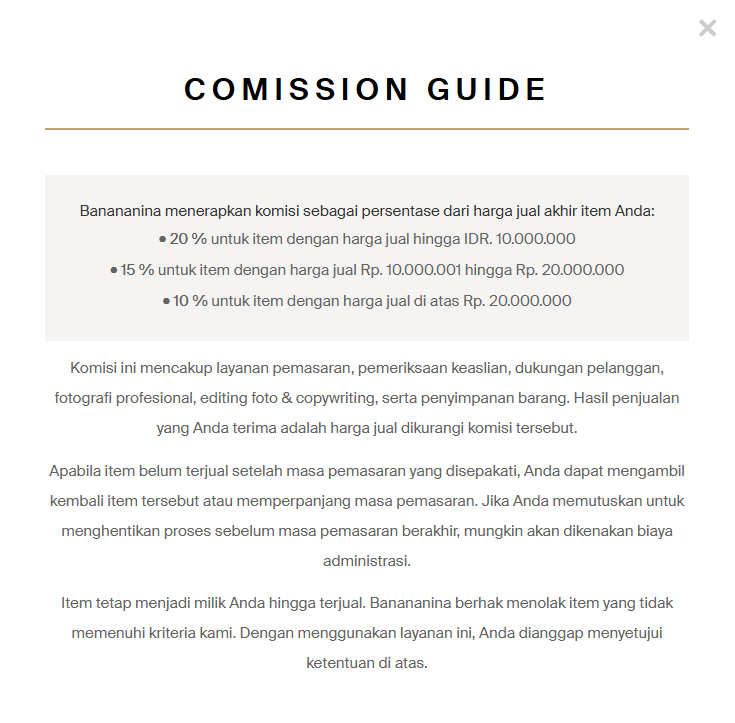 1. Untuk titip jual dan beli putus sangat cepat prosesnya dan mudah Hanya saja di sistem pembayaran titip jual mungkin perlu ada standarisasinya (SLA) nya brp lama uang tersebut diberikan ke penitip. Karena kadang lama sekali dan kadang cepat 2. Untuk petugas team banananina sangat responsif dan ramah2. 3. Barang2 yang dititip jual maupun beli putus sdh cukup baik untuk harga yg ditawarkan dan masih bisa di negosiasikan