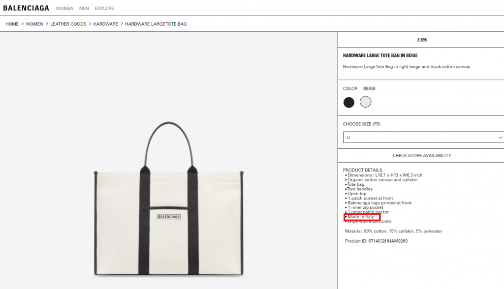 When checking Balenciaga products in-store, most of the products were made in Italy or China, which wasn’t surprising after I analyzed the brand’s website.