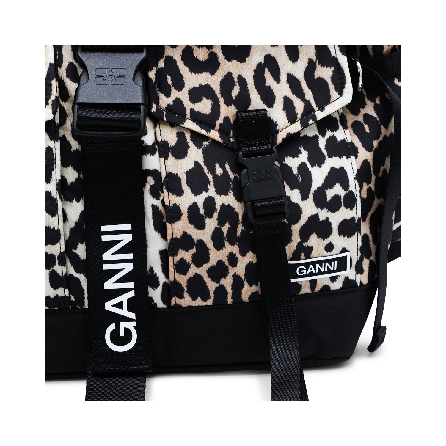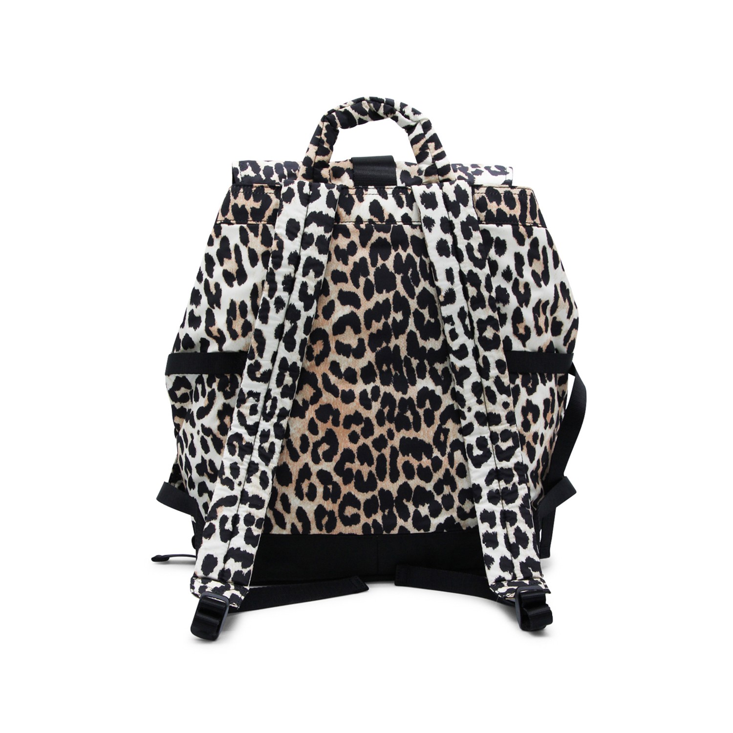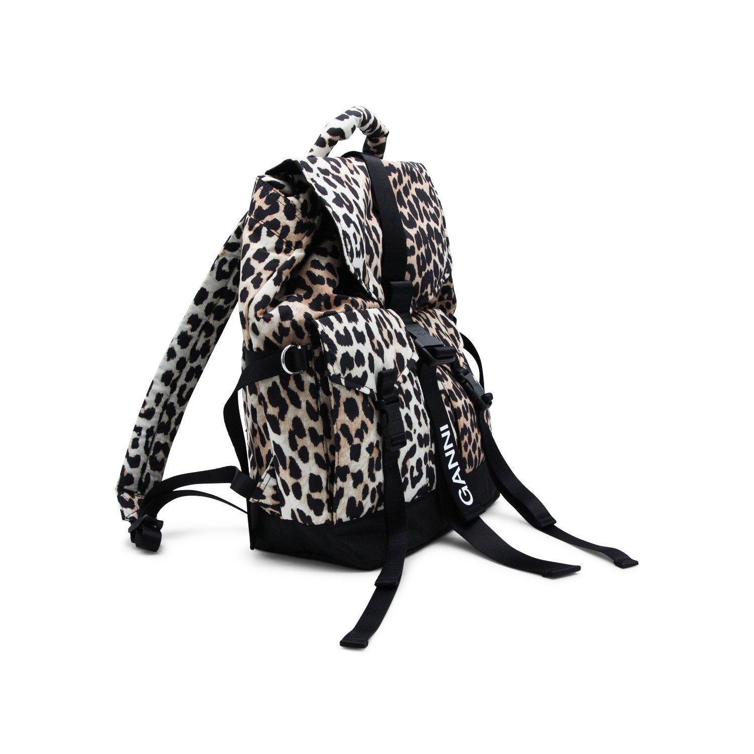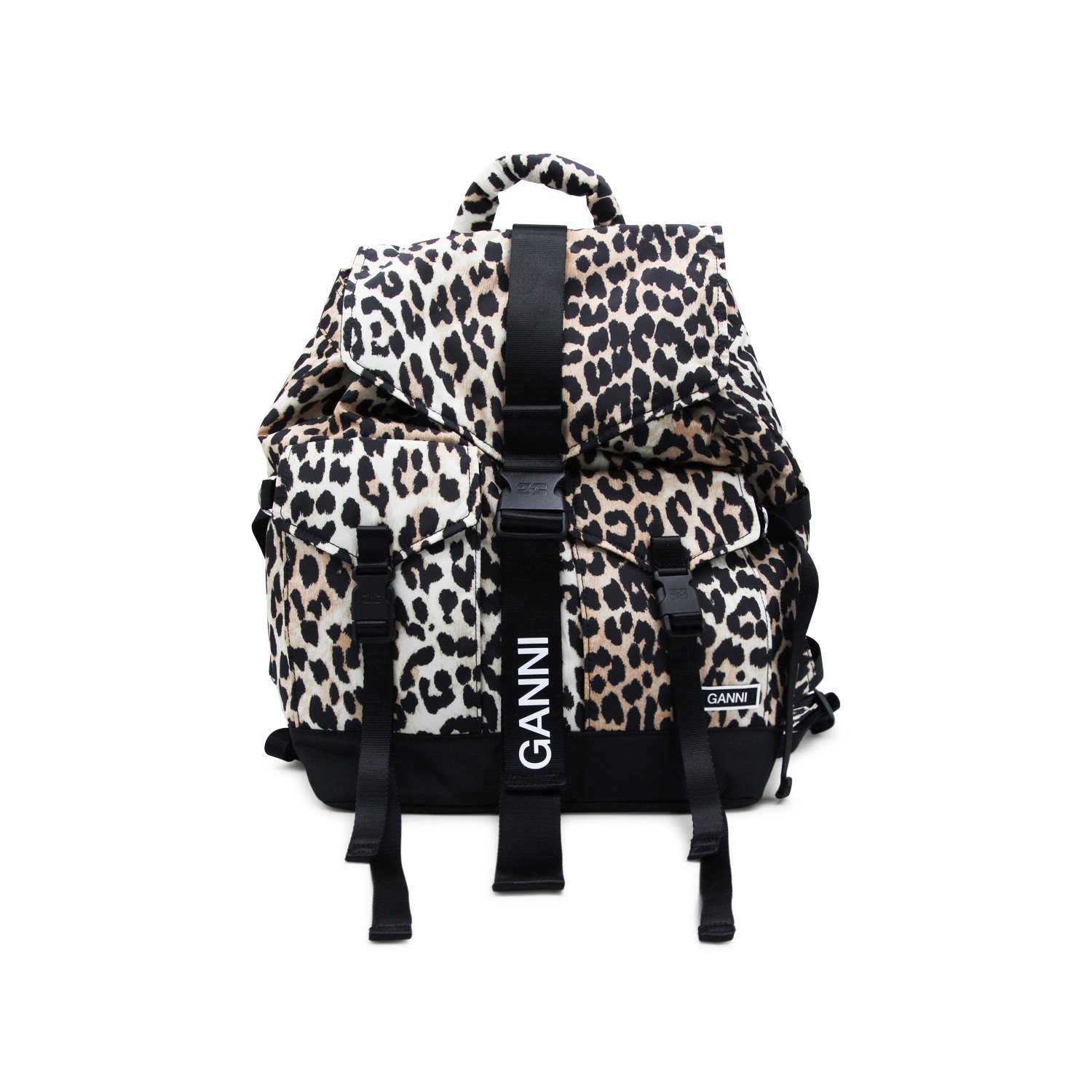 Leopard backpack from Ganni featuring adjustable shoulder straps, top handle, foldover top, front pockets, buckle fastening and main compartment.