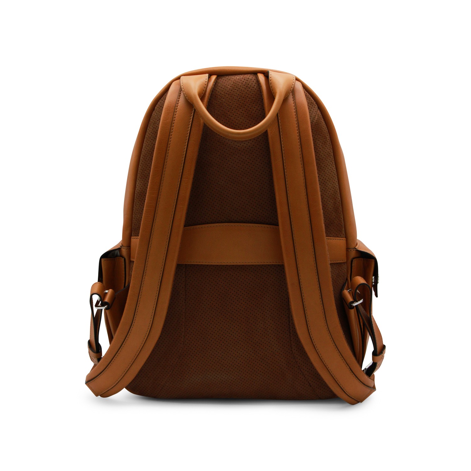 Brown leather backpack from Brunello Cucinelli featuring adjustable shouder straps, embossed logo at front, main compartment, zipped pocket and side pockets.