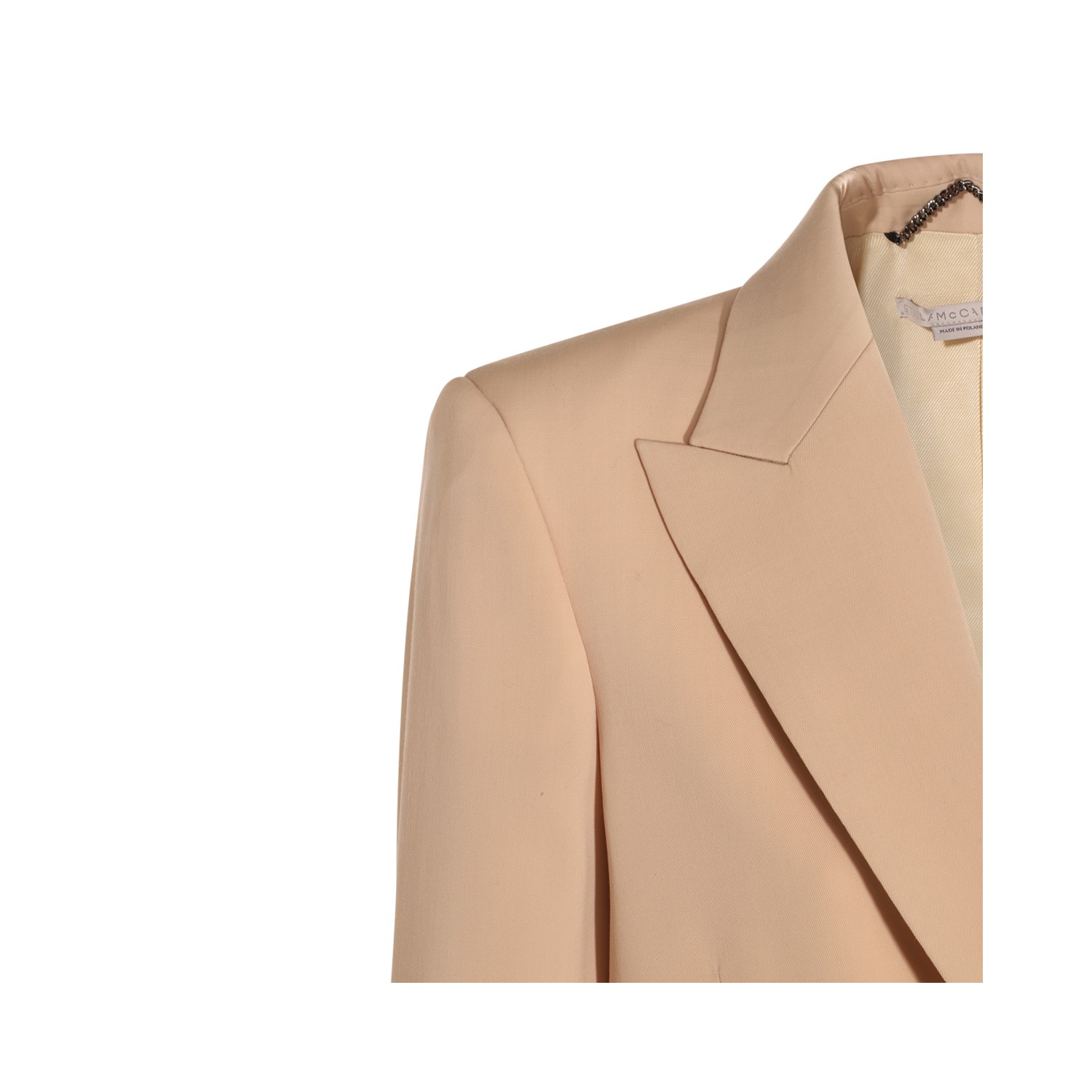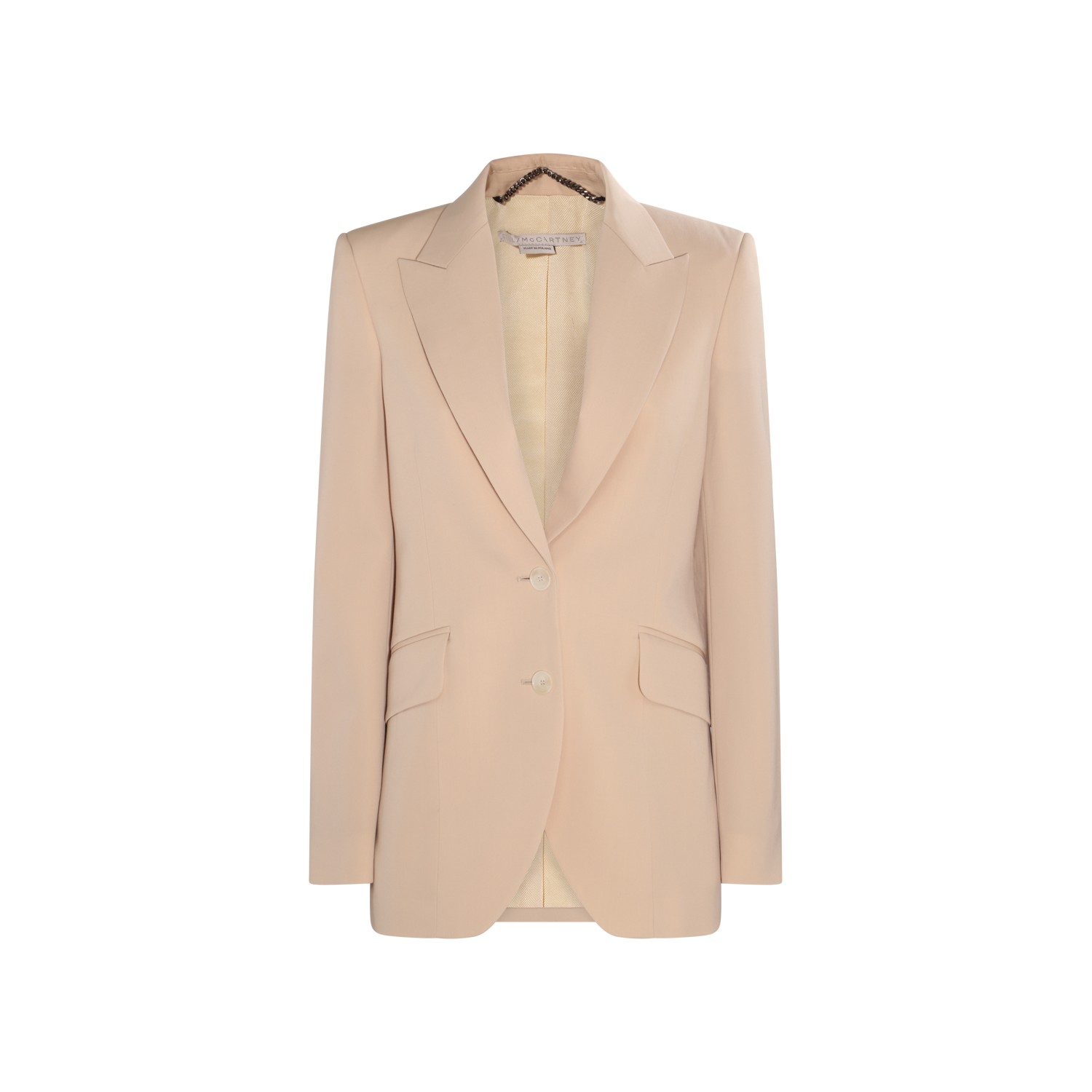 Oat wool balzer from Stella McCartney featuring relaxed fit, long sleeves, single breasted, front welted pockets and satin lining.