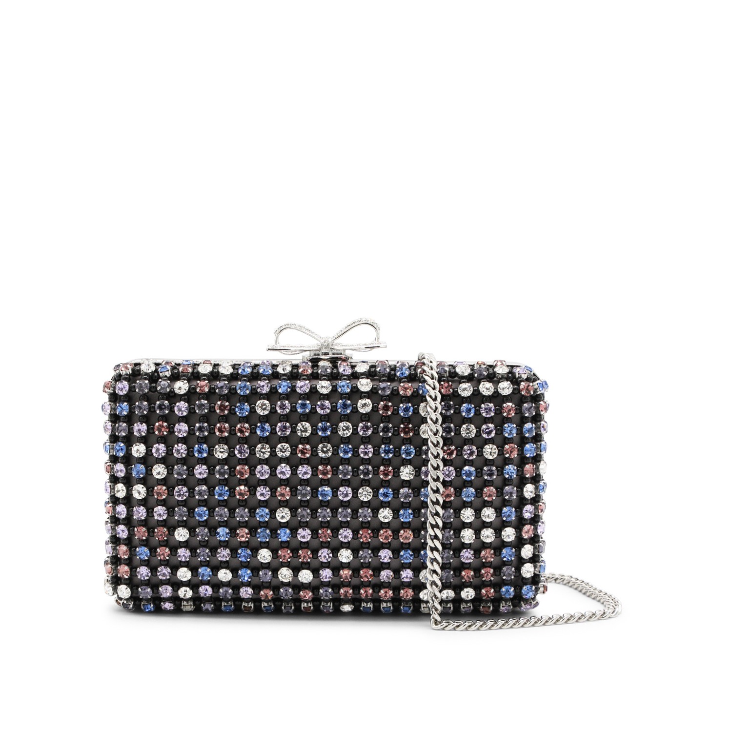 Multicolor clutch from Self-Portrait featuring upper fastening, inside pocket, all over details and removable strap.