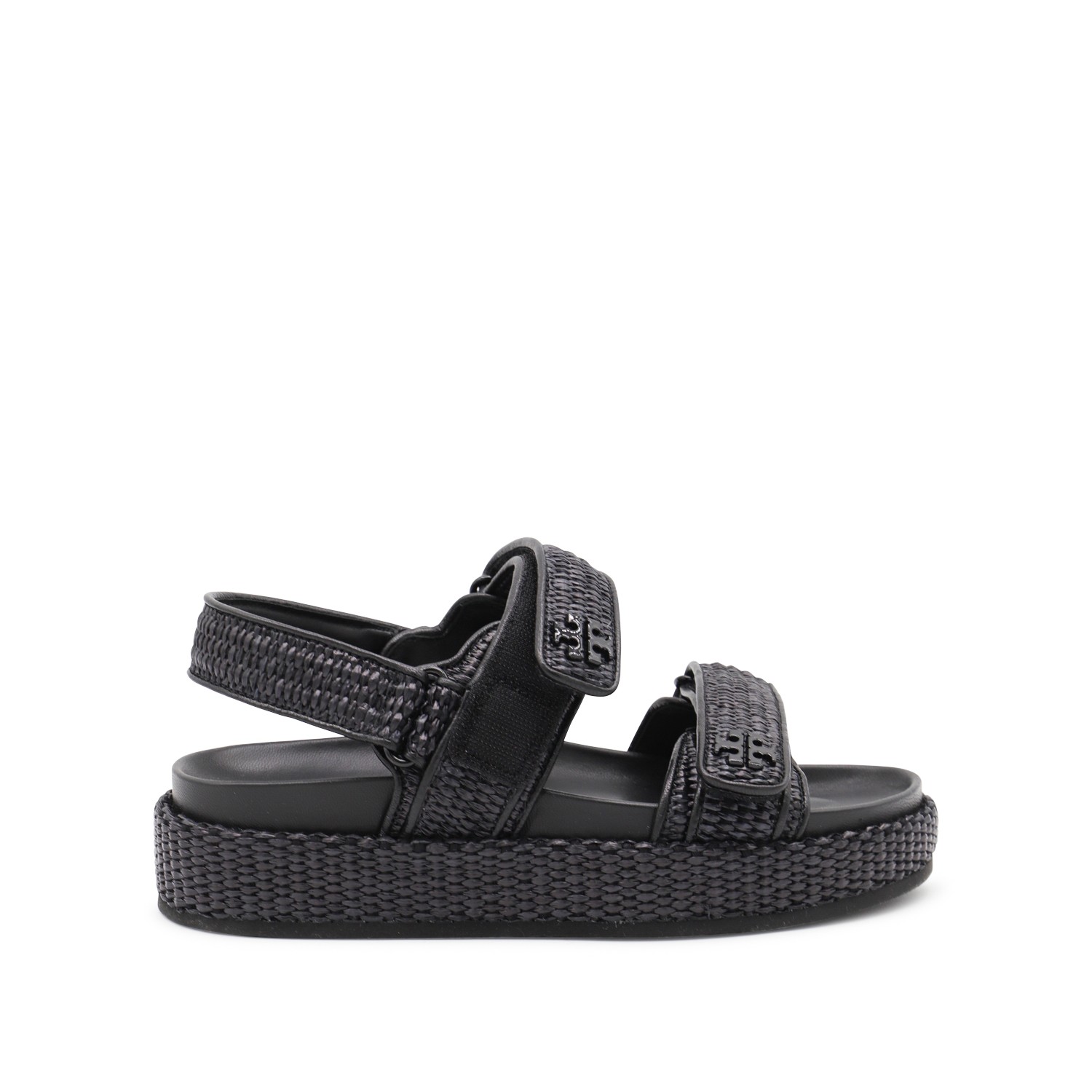 Black leather flats from Tory Burch featuring round open toe, back fastening, logo, open back and leather sole.