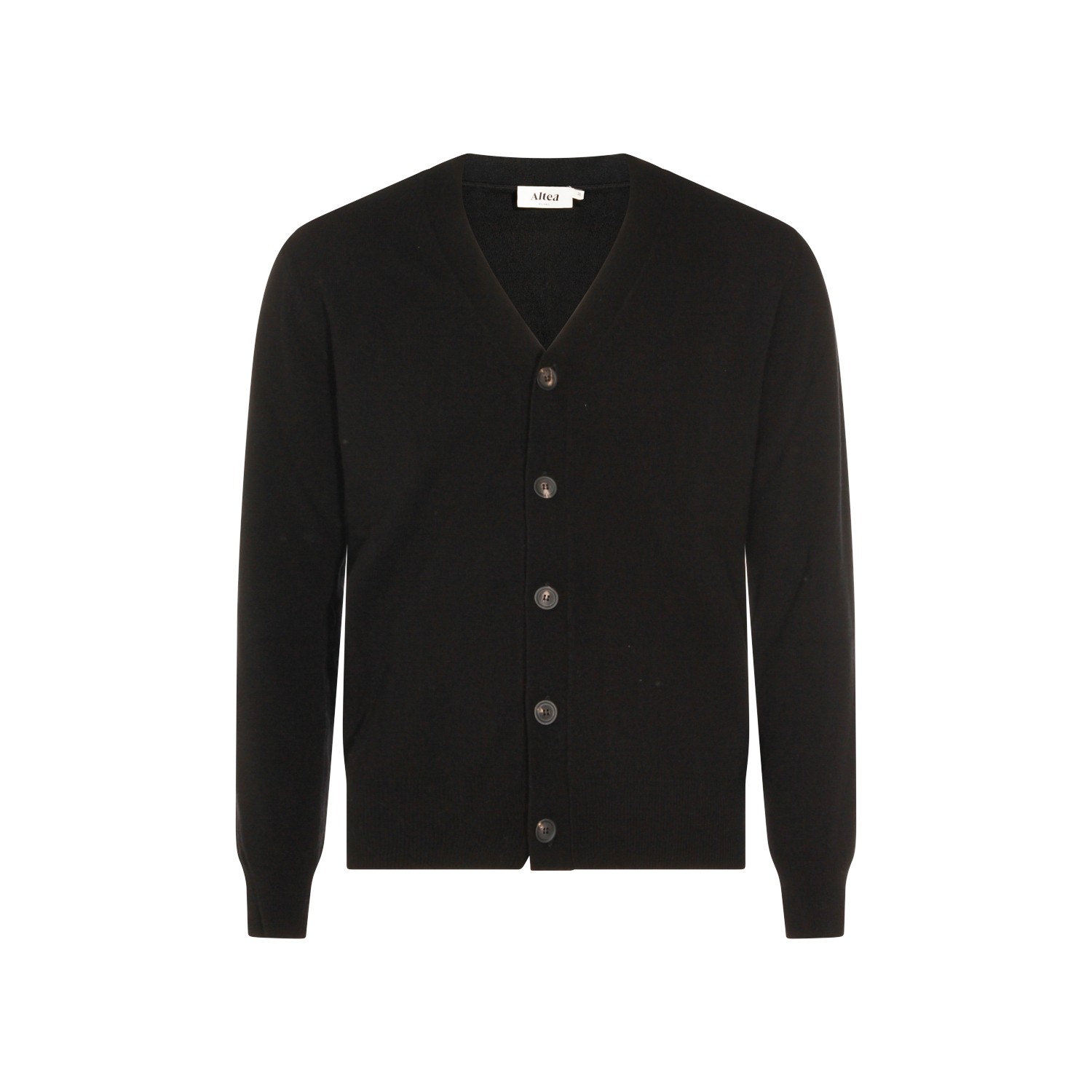 Black knitwear from Altea featuring long sleeves, frontal buttons fastening, ribbed cuffs and hem and soft vestibility.
