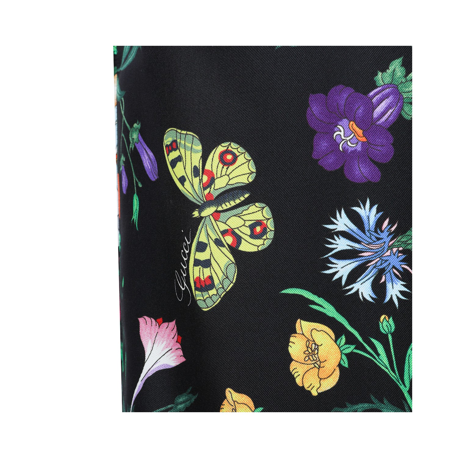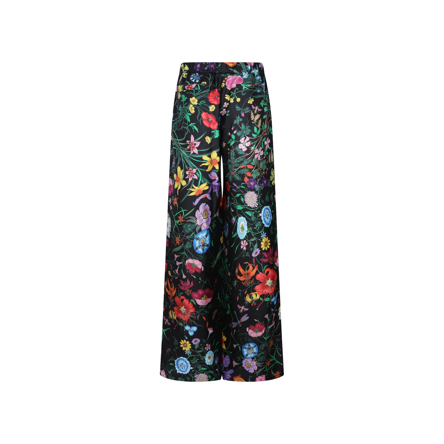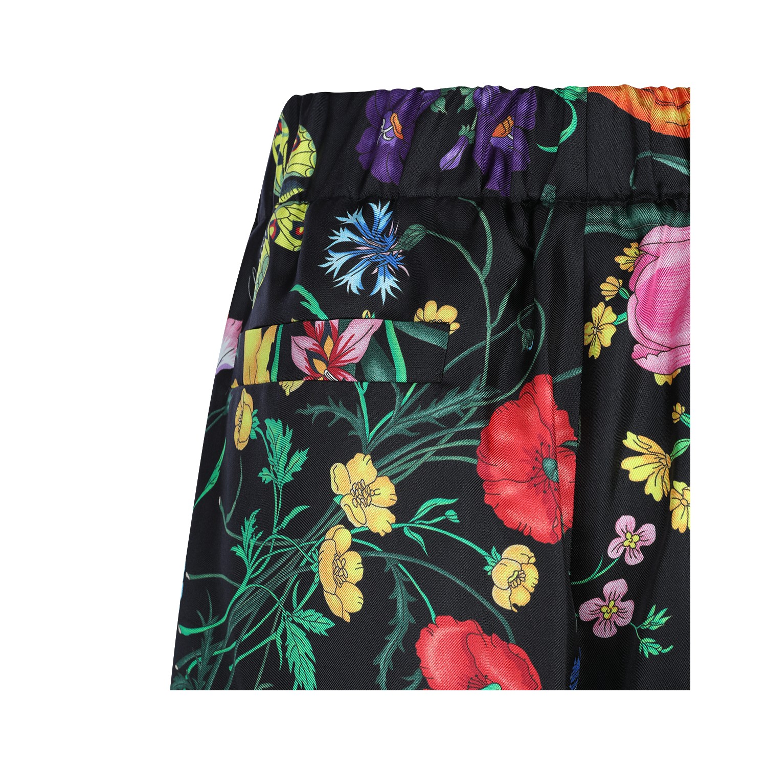 Multicolor silk pants from Gucci featuring elastic waistband, zip and button closure, floral print and wide leg.