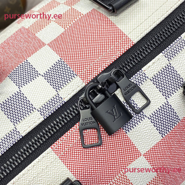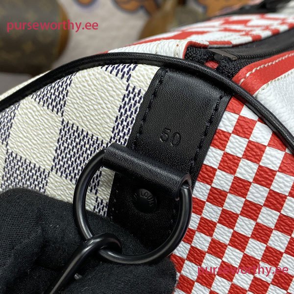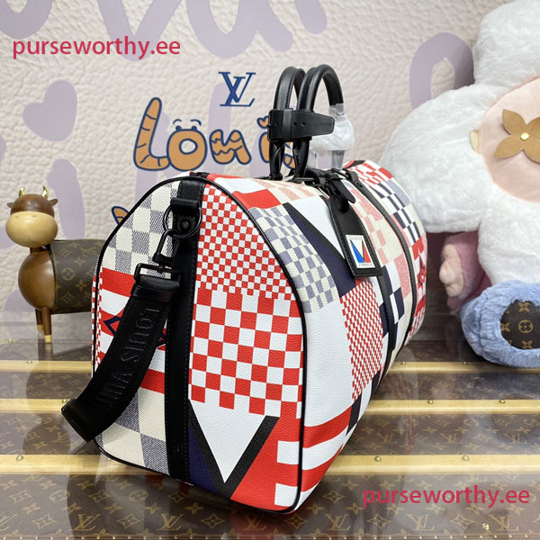 Part of the America’s Cup collectsion, this eye-catching Keepall Bandoulière 50 bag is made from Damier Flags canvas. The Damier Flags print evokes the tradition of flag signaling in the maritime world. Imagined as a patchwork of different flags, the Damier pattern is created through a checkered print, playing with scale and color.
