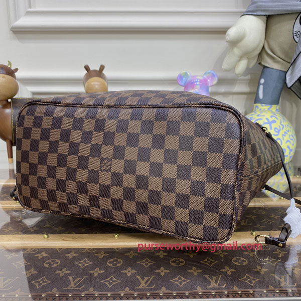The Neverfull MM tote unites timeless design with heritage details. Elegant in Damier Ebene canvas with natural cowhide trim, it is roomy but not bulky, with side laces that cinch for a sleek allure or loosen for a casual look. Slim, comfortable handles slip easily over the shoulder or arm. Lined in colorful textile, it features a removable pouch which can be used as a clutch or an extra pocket.