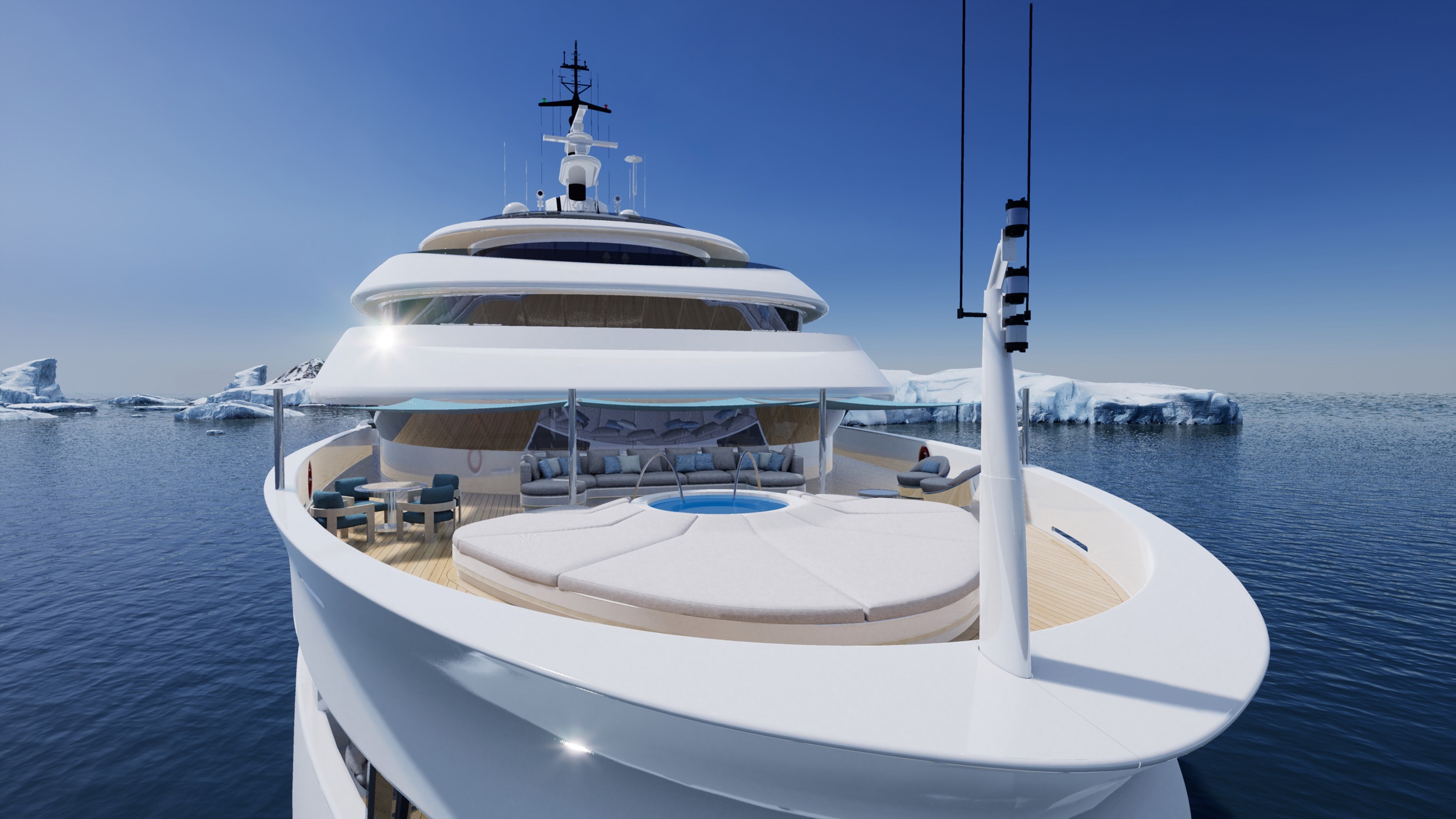 The garage of the yacht can be seen and accessed via a large bi-folding glass door and can carry any and all tenders and toys including a 12.5-metre custom tender, hydrofoil speedboat, submarine and a host of kite and windsurfing equipment, diving equipment, surfboards and Jetskis. When travelling to extreme environments like the Antarctic and Arctic, would be able to protect the chopper with safety missions, not to mention activities like heli-skiing.