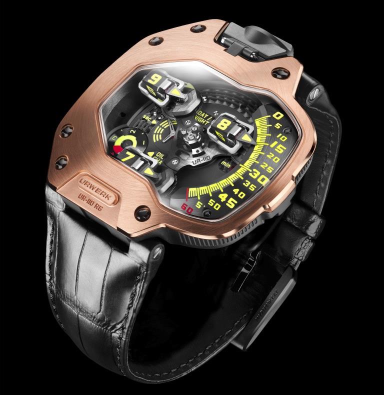 A true gentleman wouldn’t want to offend his present company by hiking back his sleeve to check the time on his watch. So obvious! The UR-110 offers a brilliant solution, one that Iron Man alter-ego Tony Stark appreciates. The time is always shown on the right side of the asymmetrical watch, again via a family of satellites that glide along an hour track. The award-winning design also incorporates an “oil change” indicator to alert the user it is time for service, and a day/night indicator. Whether encased in titanium, platinum or red gold, the unique automatic movement allows the wearer to view the time discreetly as it peeks out from under a cuff.