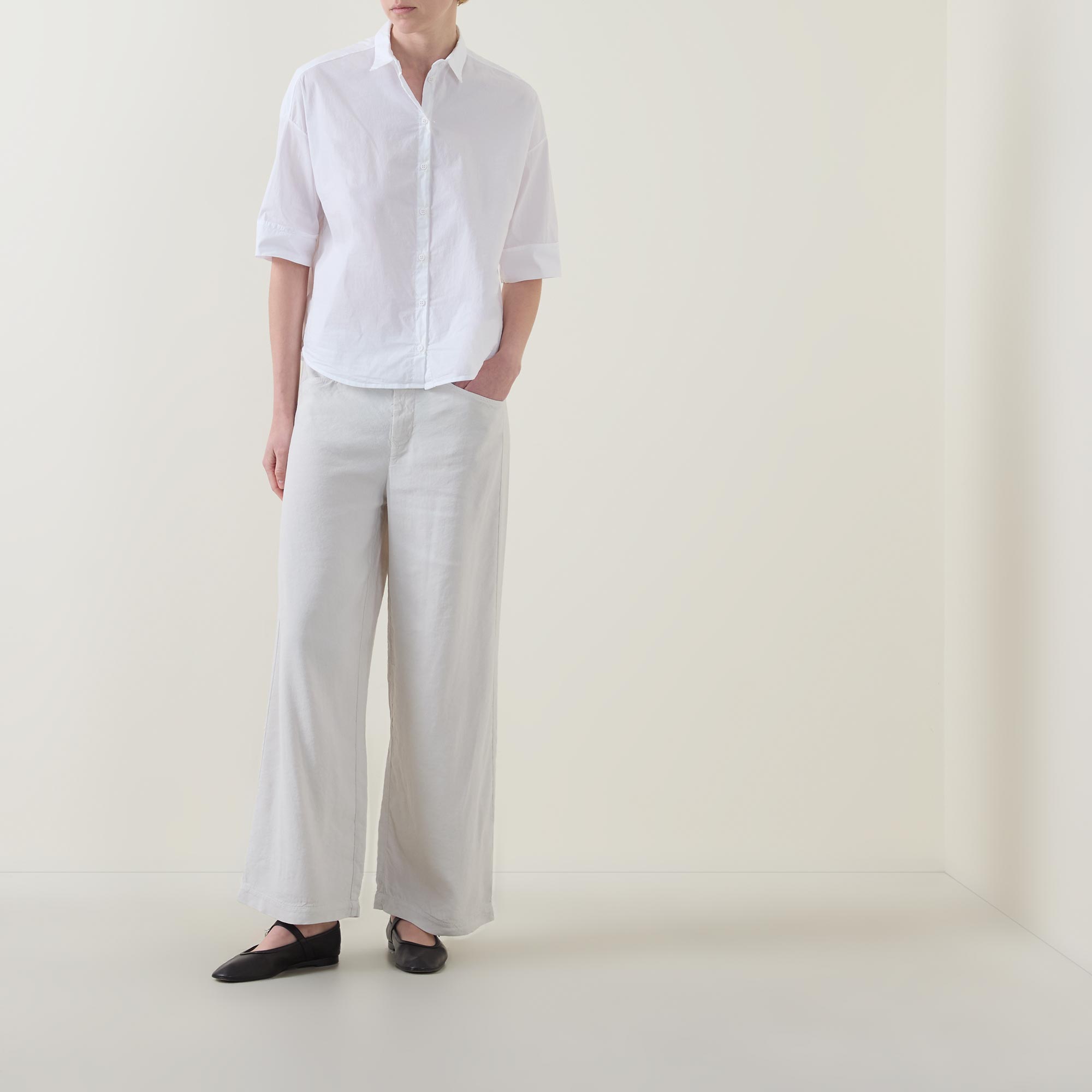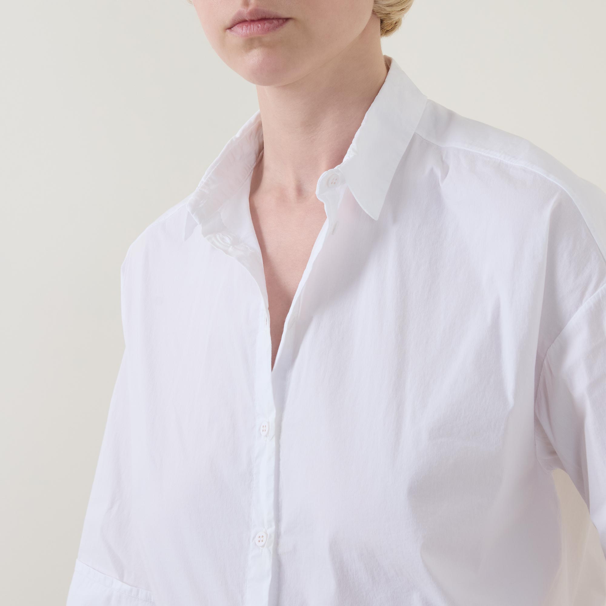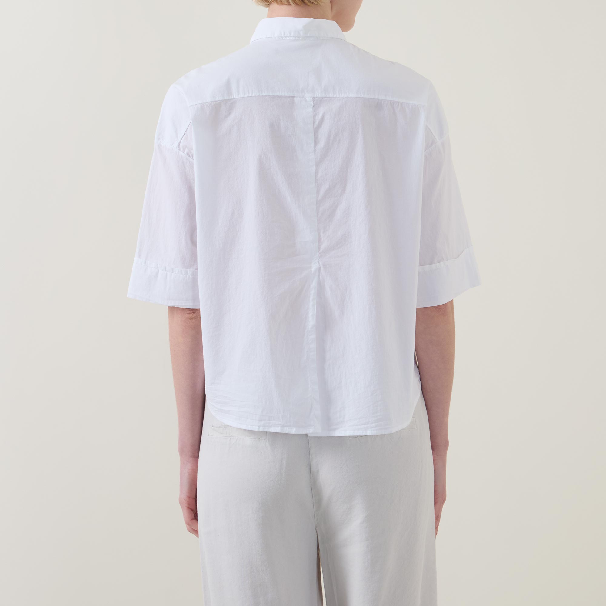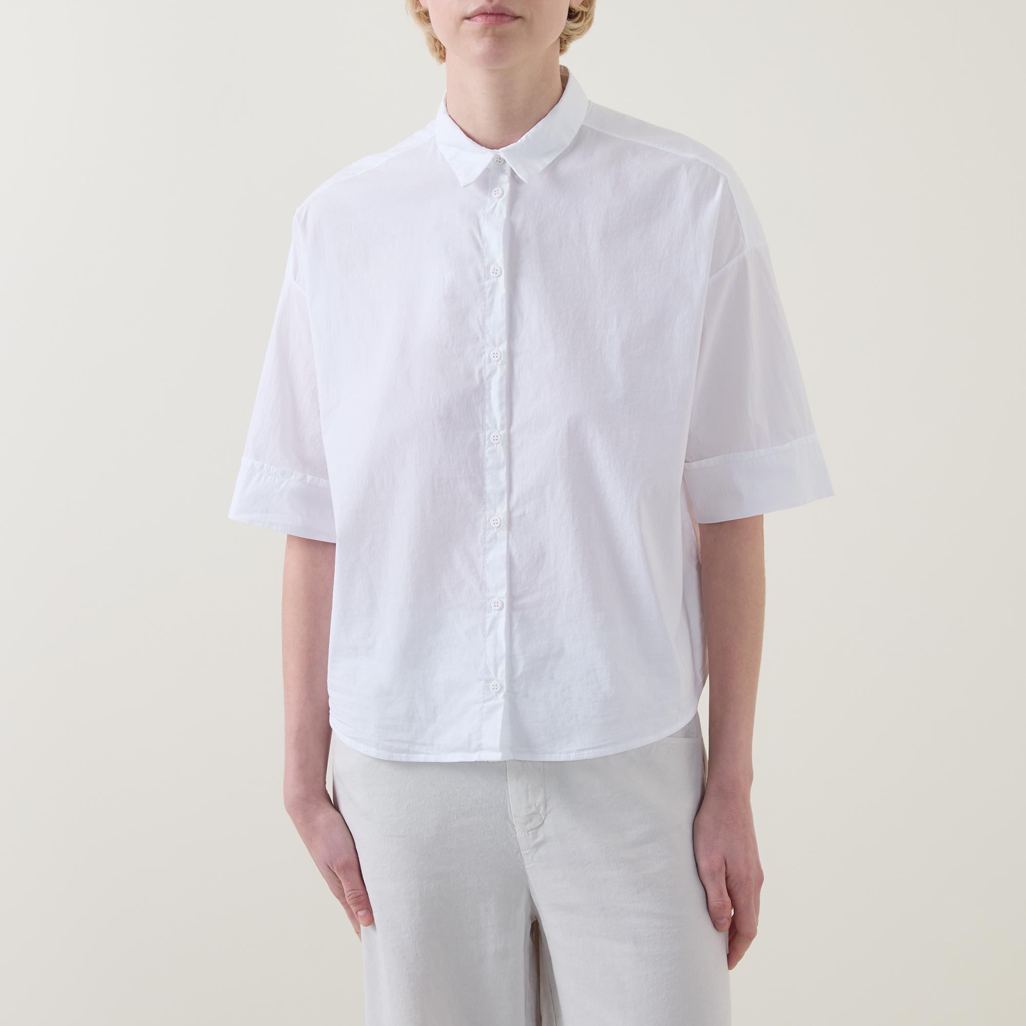 - Point collar, dropped shoulders, short sleeves, bound cuffs, front button fastening, curved hem, rear box pleat