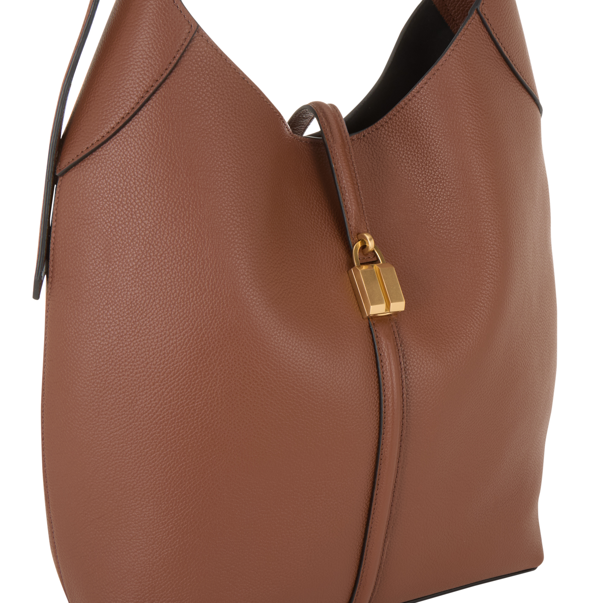 - Adjustable shoulder strap, magnetic dot fastening, strap with signature padlock detail, gold-tone hardware, grained leather finish, softly structured silhouette
