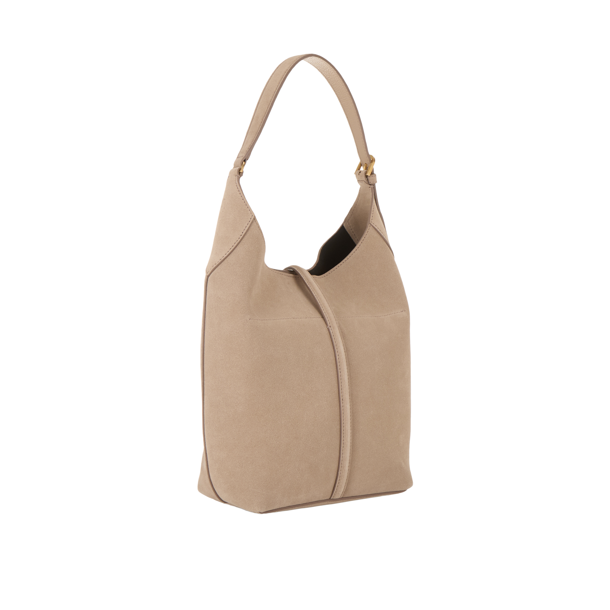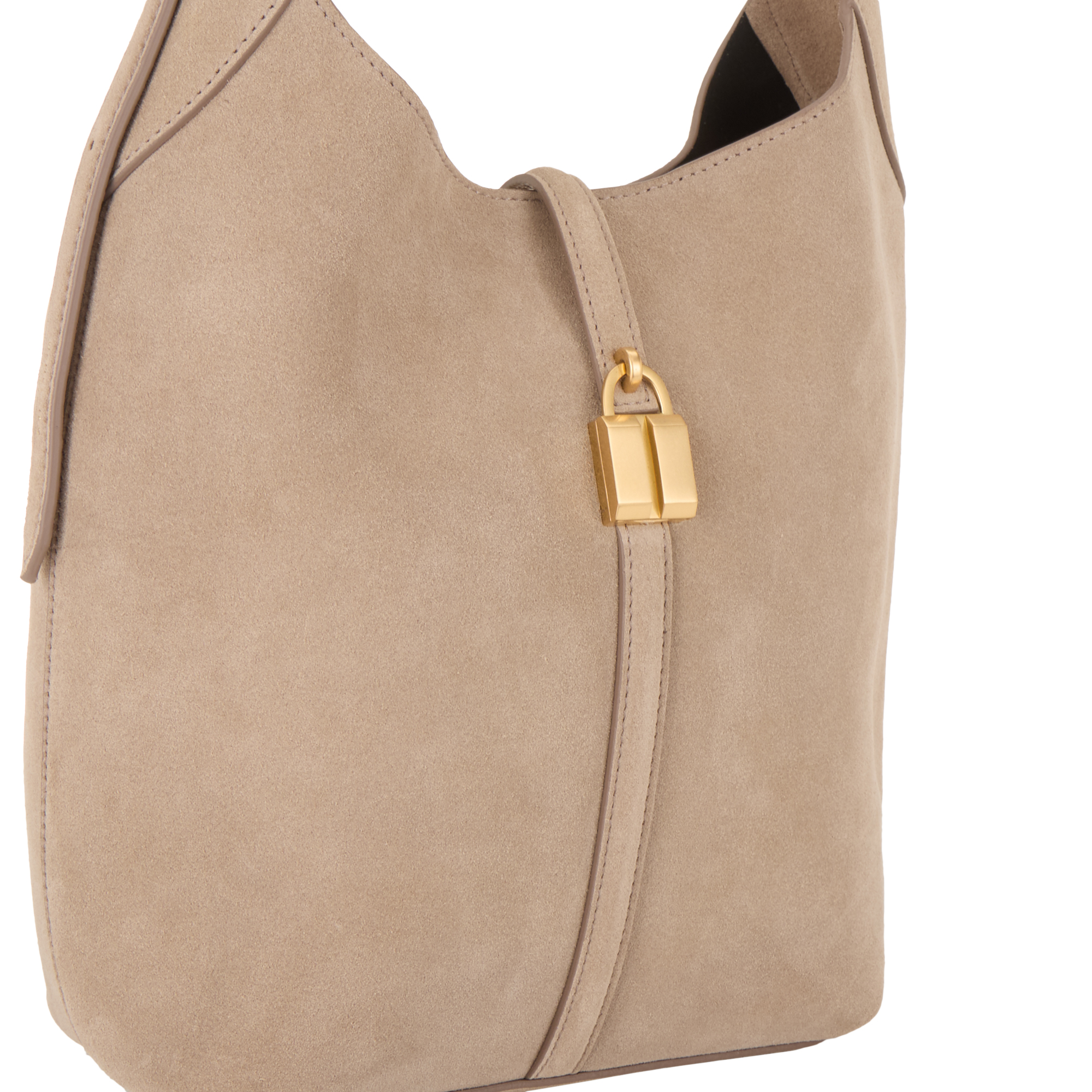 - Adjustable shoulder strap, magnetic dot fastening, strap with signature padlock detail, gold-tone hardware, suede leather finish, softly structured silhouette