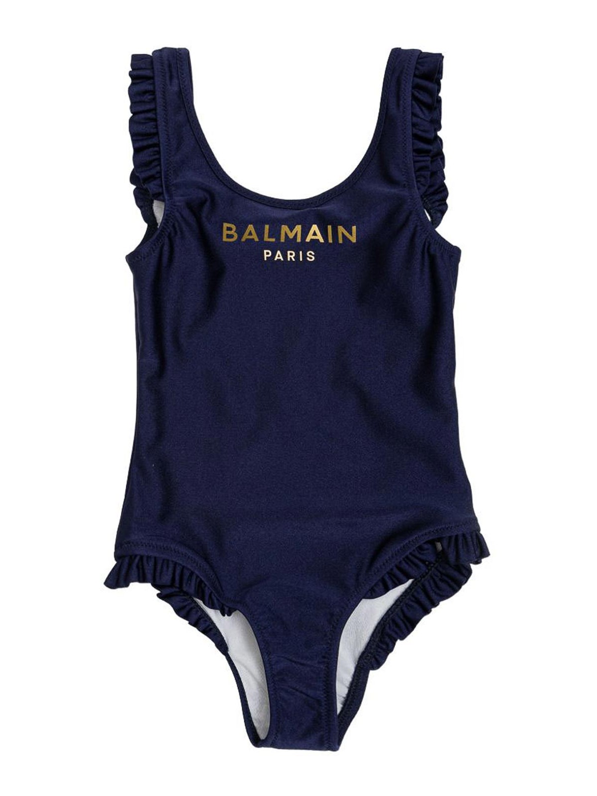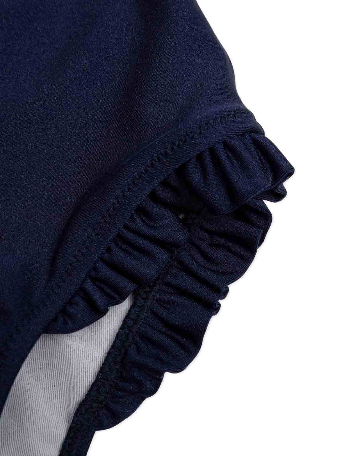 Rüschen-Badeanzug mit marineblauem Logo, gerafftem Rand, ärmellosem, weitem Halsausschnitt