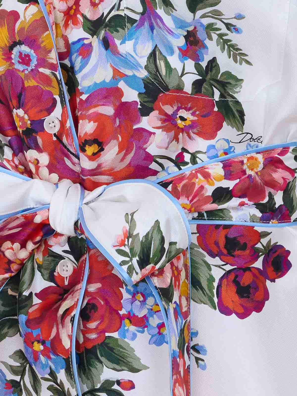Mehrfarbiges Hemd von Dolce & Gabbana mit Knopfverschluss an der Vorderseite, kurzen Ärmeln, Tasche auf der Vorderseite, Gürtel an der Taille, V-Ausschnitt