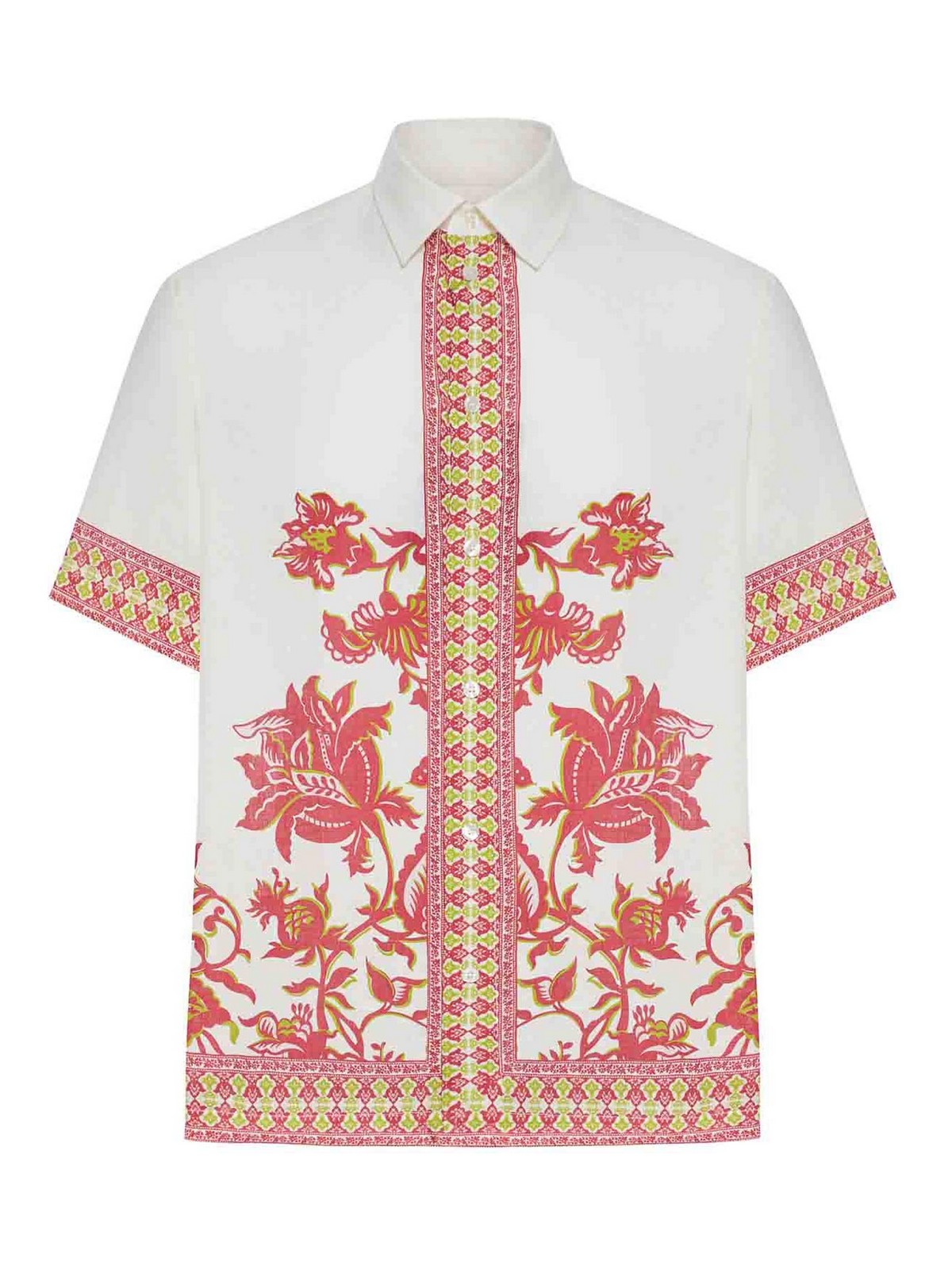 spitzer Kragen, kurze Ärmel, Verschluss mit Logo-Knöpfen, lockere Passform, kontrastierender Blumendruck an der Unterseite des Kleidungsstücks und ein geometrisches Motiv an Verschluss und Manschetten, 100% Leinen, das Model ist 186 cm groß und trägt Größe M, Farbe: mehrfarbig
