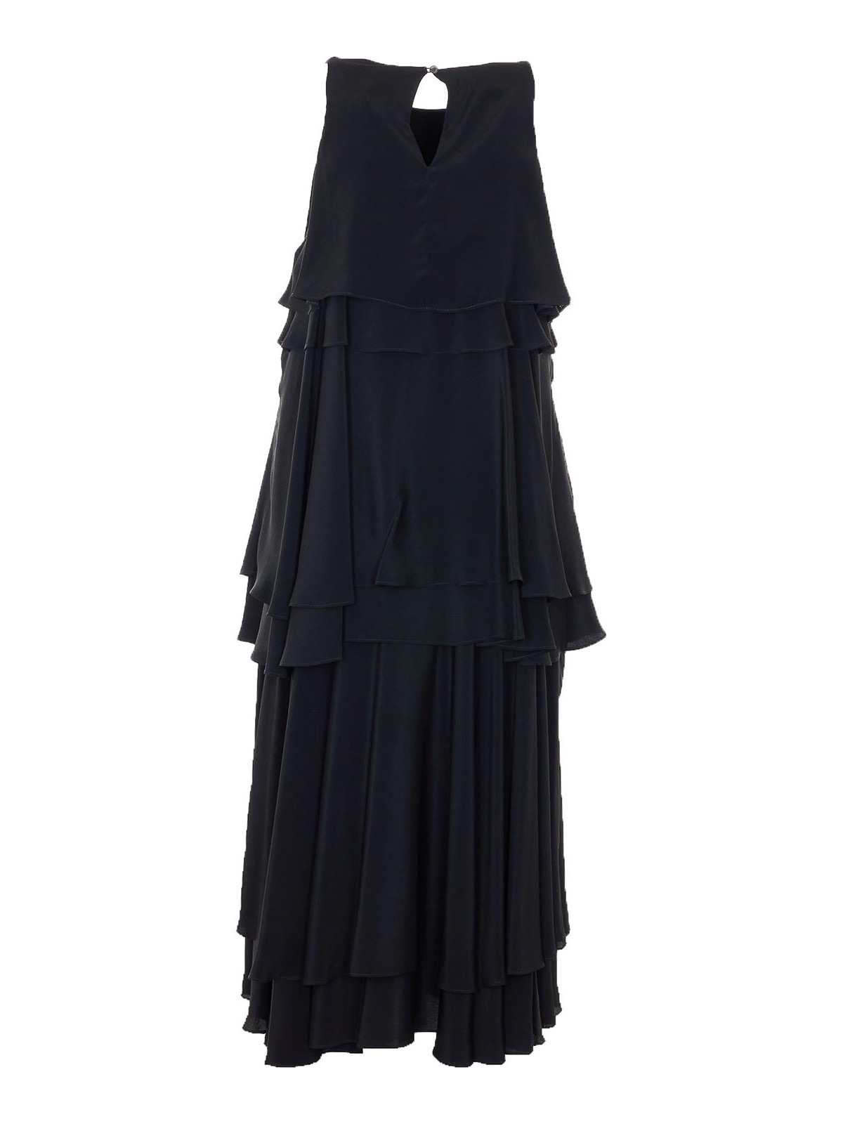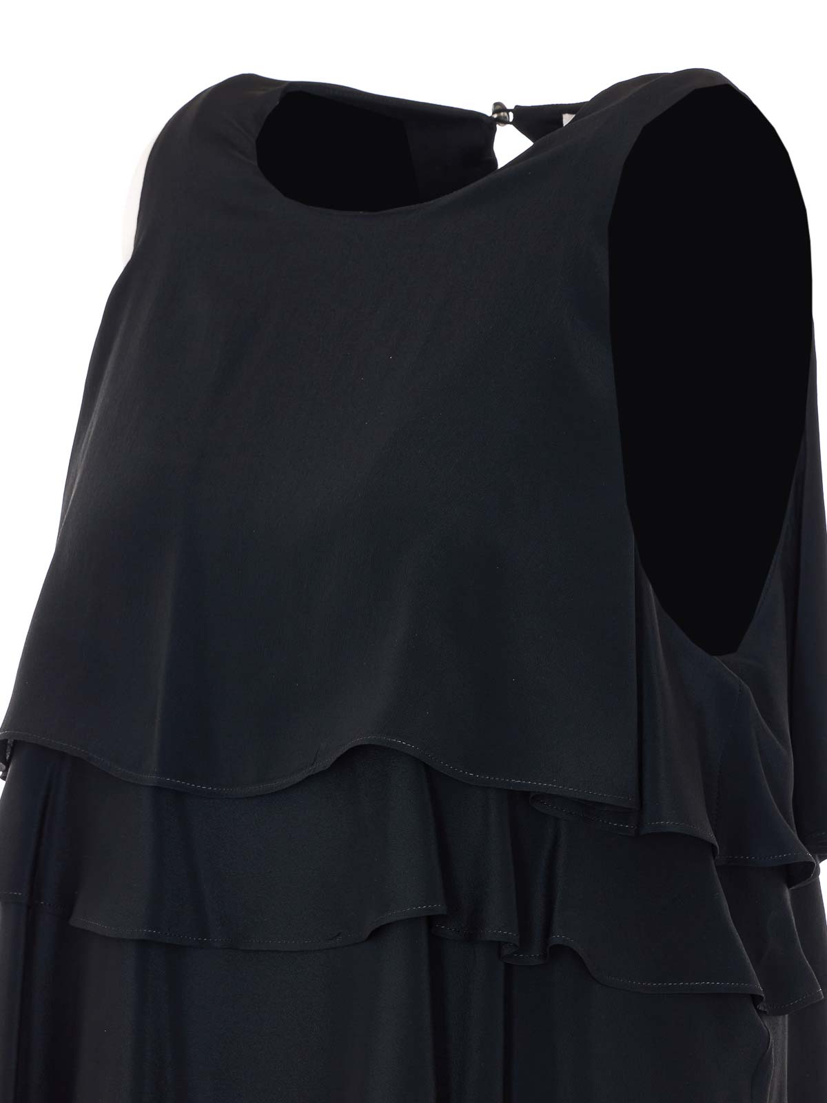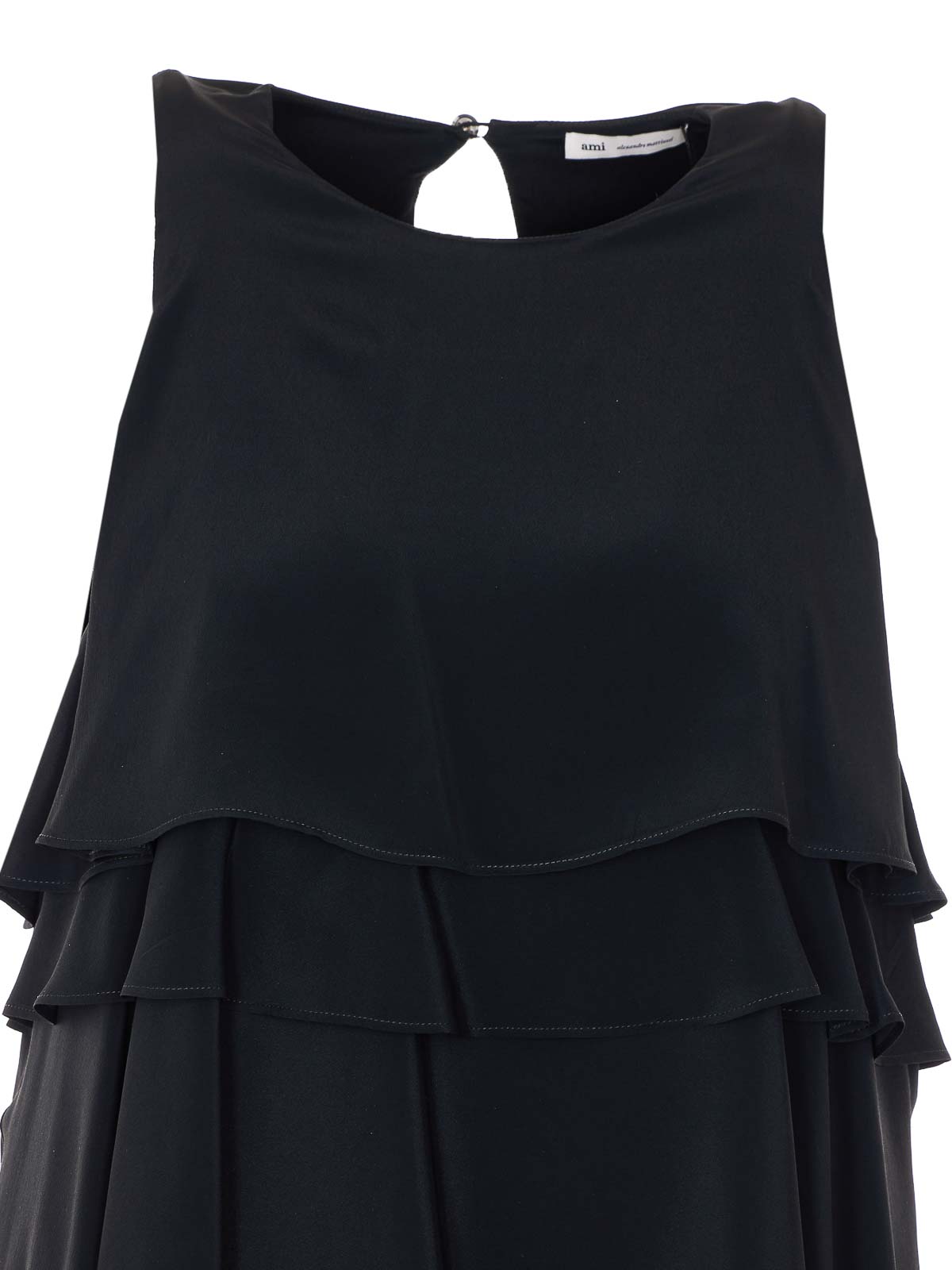 Ami - Alexandre Mattiussi schwarzes langes Kleid mit Rüschen, Knopf auf der Rückseite, ärmellos, Rouches-Details