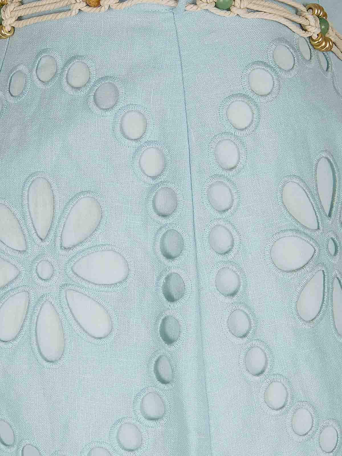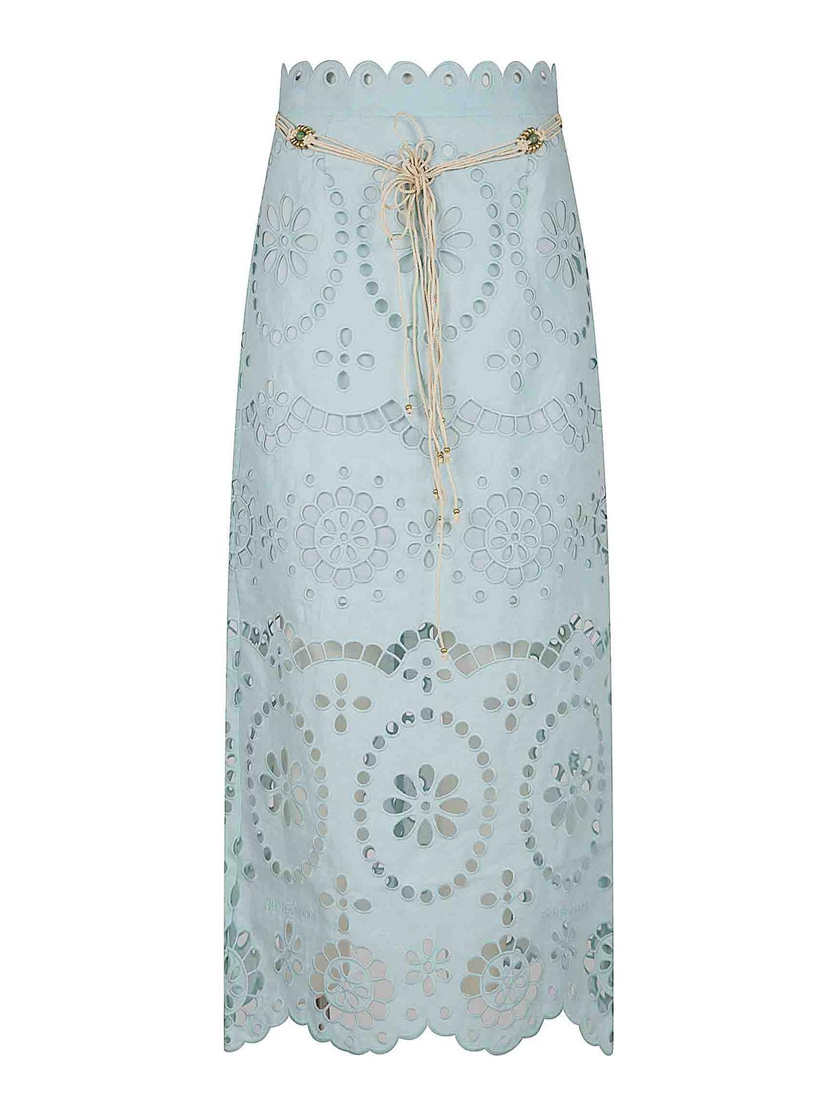 Awake Leinenrock von Zimmermann, eng anliegender Bund mit unsichtbarem Reißverschluss in der Mitte, hinten, Schlitzdesign, Midilänge mit kurzen Ärmeln, verziert mit abnehmbarem Gürtel, gekennzeichnet durch Bogenstickerei an Taille und Saum.