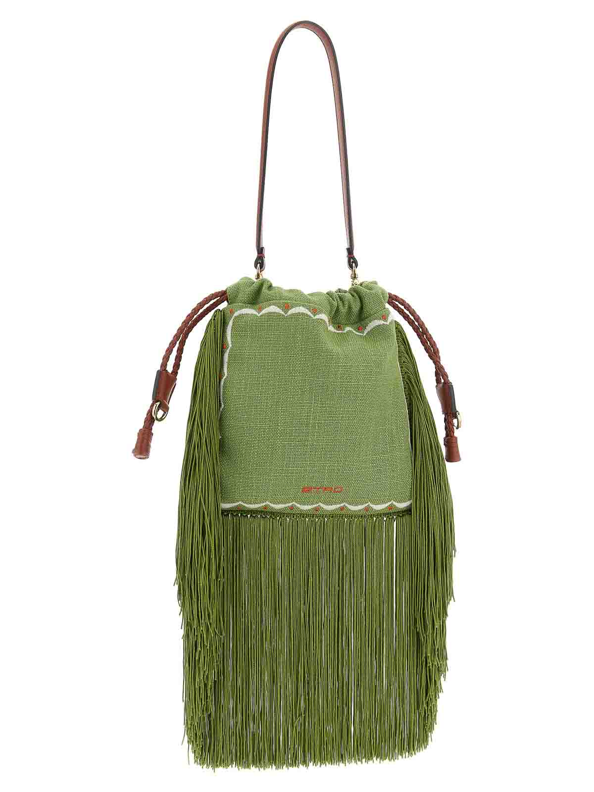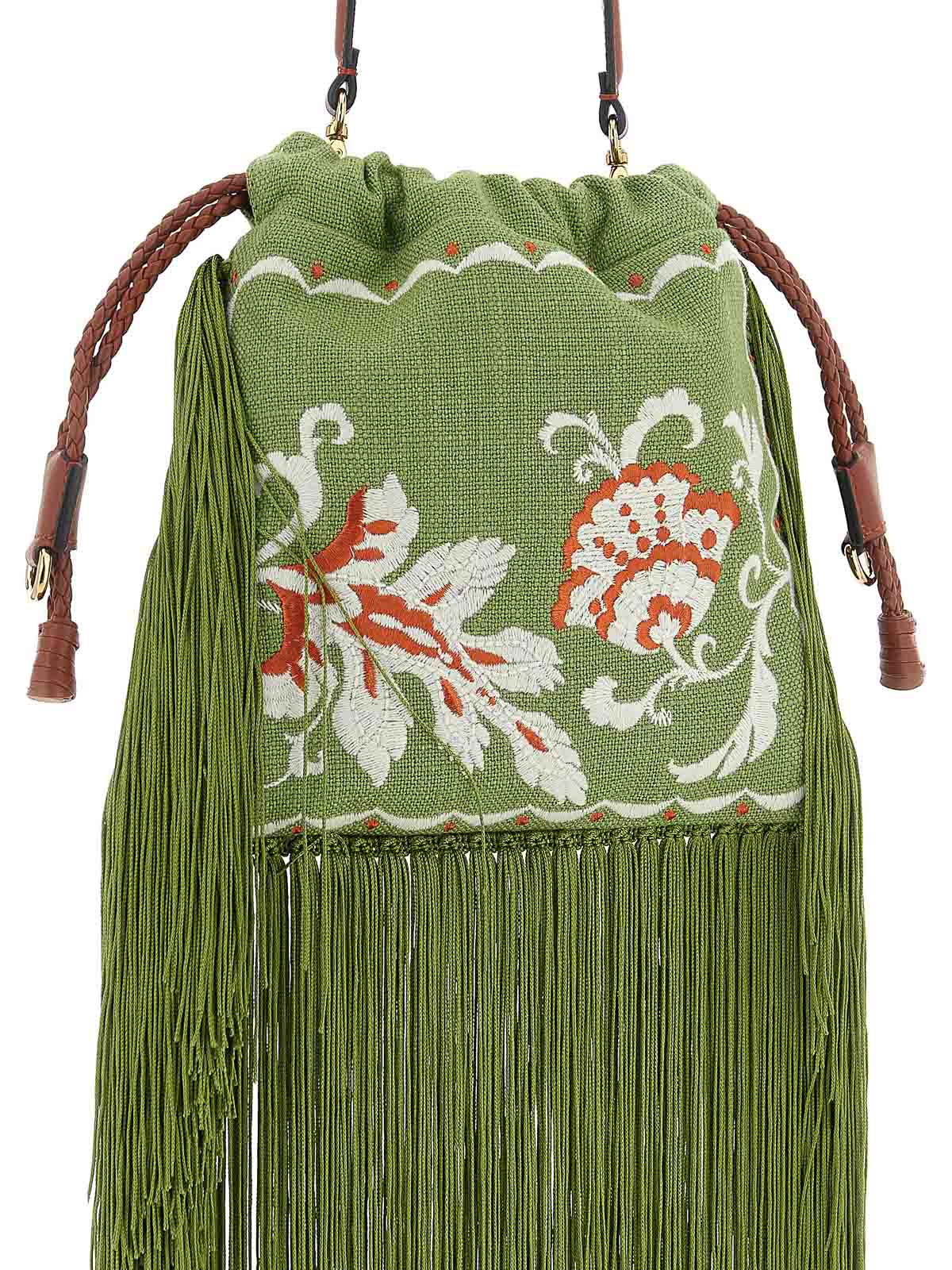 Kleine Handtasche „Kalispera“ aus einer Mischung aus Leinen und Viskose, kontrastfarbenes Futter, Beuteldesign, Blumenstickerei auf der Vorderseite, Stickerei auf der Rückseite, lange Fransen an den Rändern, Kordelzug aus geflochtenem Leder, abnehmbarer Ledergriff