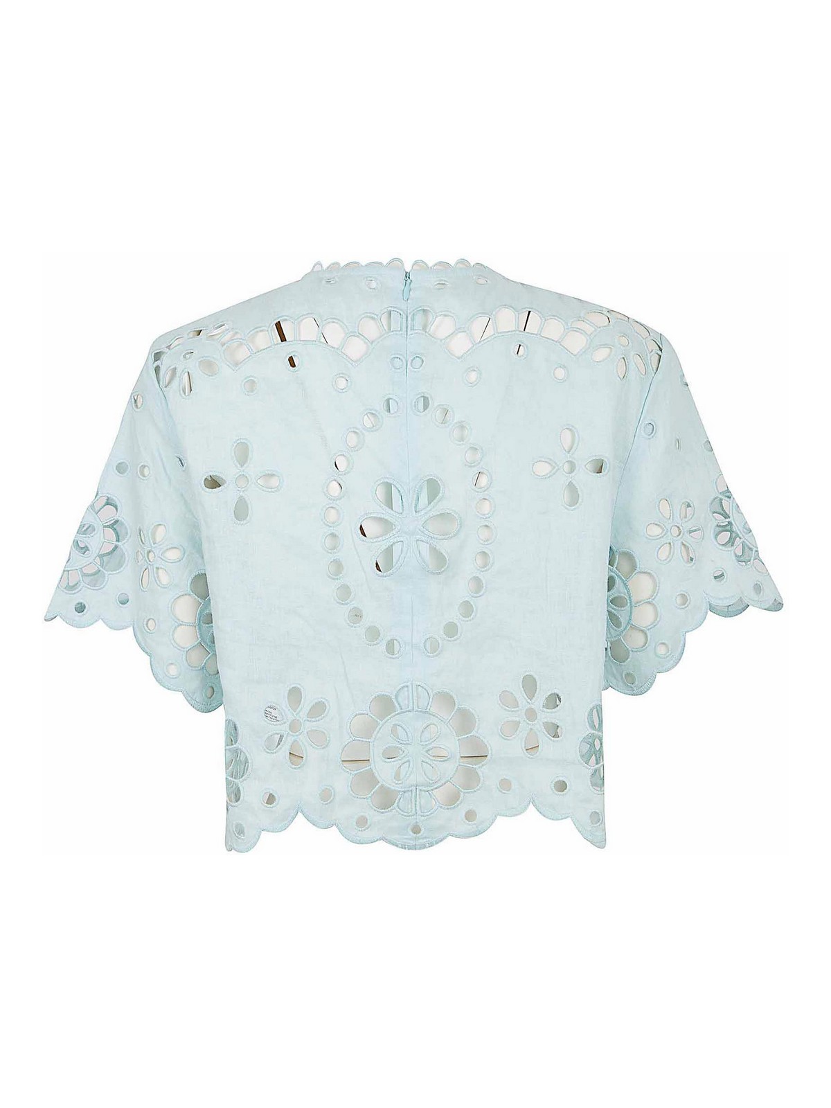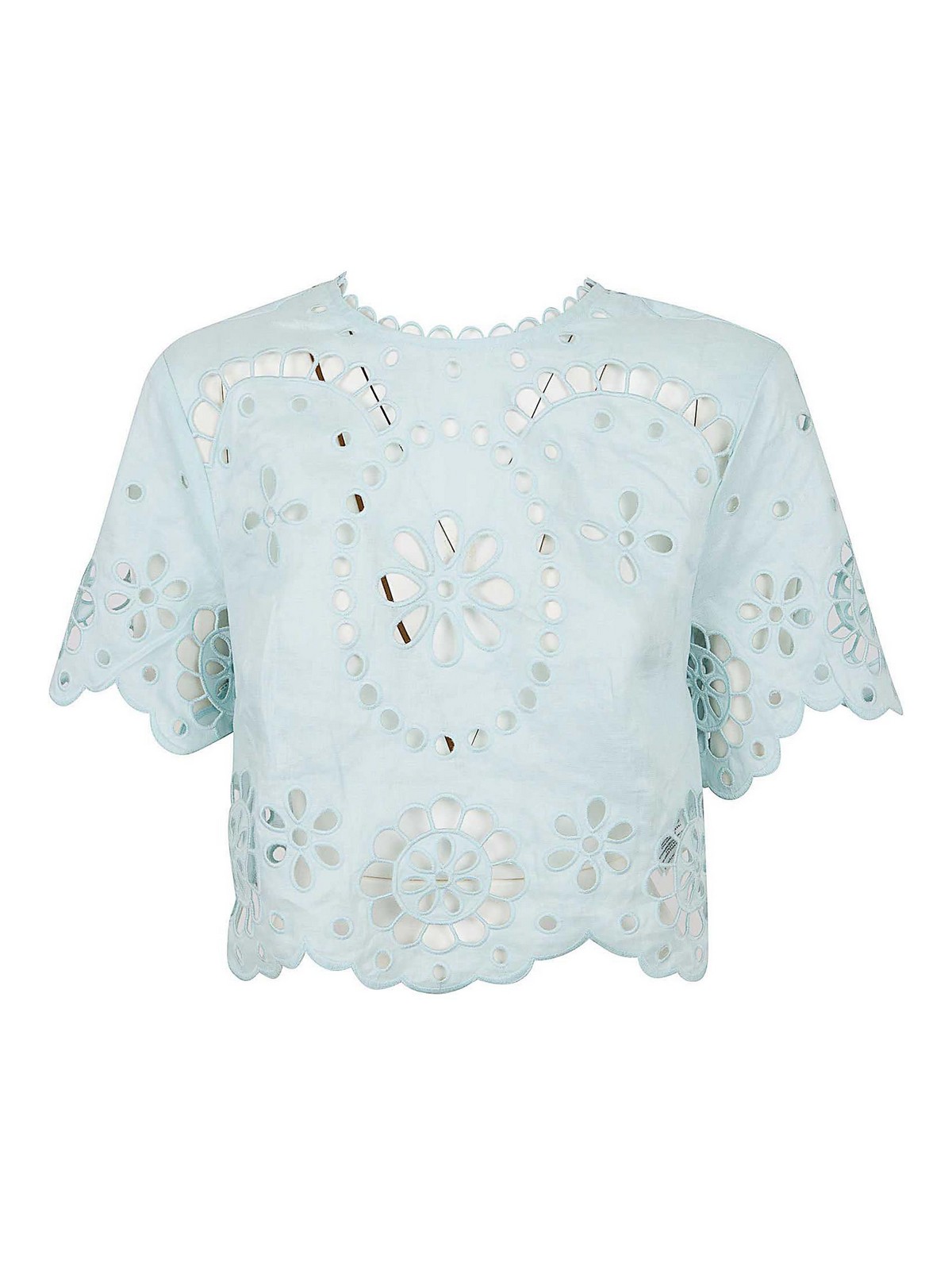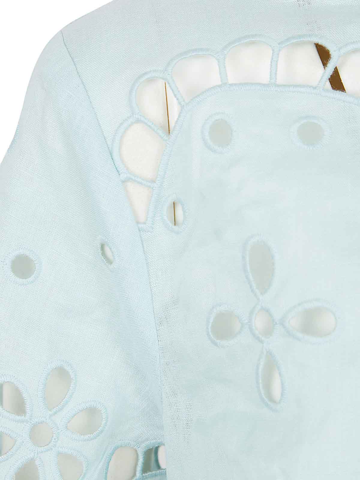 Awake Oberteil aus Zimmermann-Leinen, kurze Ärmel mit unsichtbarem Reißverschluss auf der Rückseite, kurz geschnittenes Design und separater Bralette mit durchgehendem Stickmuster und gewellten Kanten an den Säumen
