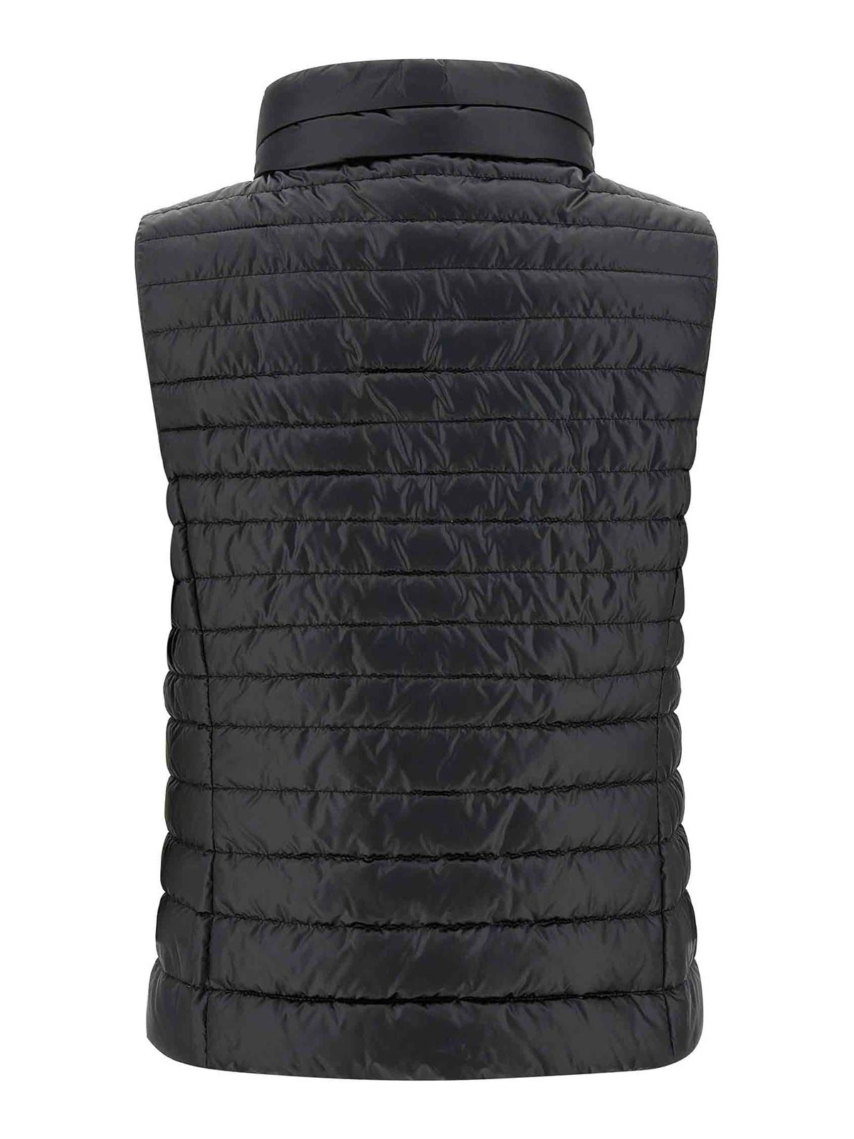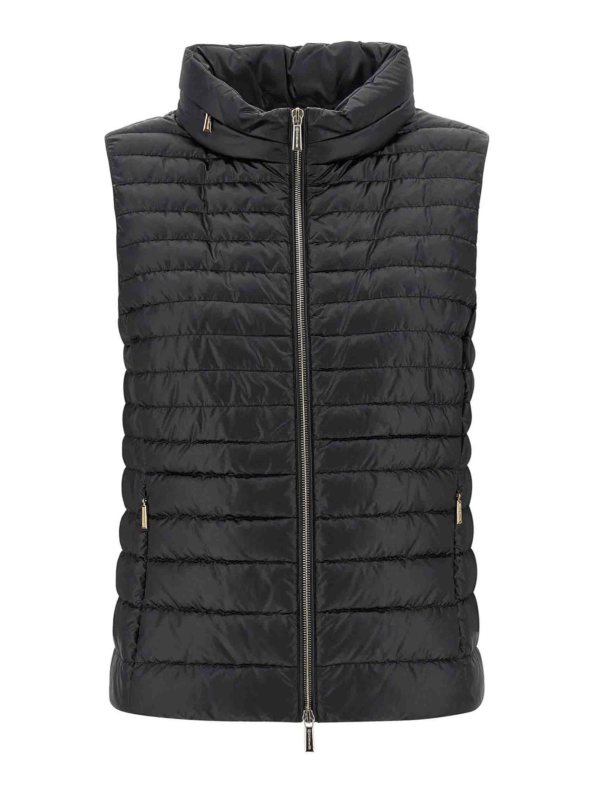 Villan-Weste aus poliertem technischem Gewebe, gesteppt und mit Gänsefedern gepolstert, Stehkragen mit abnehmbarer Kapuze, Frontreißverschluss, Taschen.