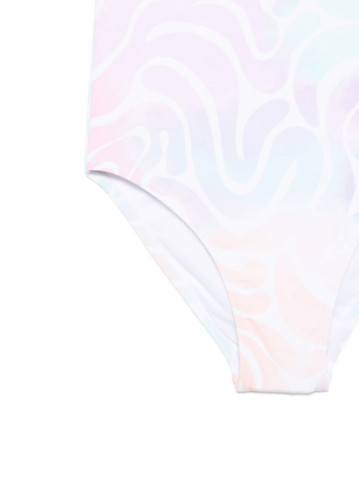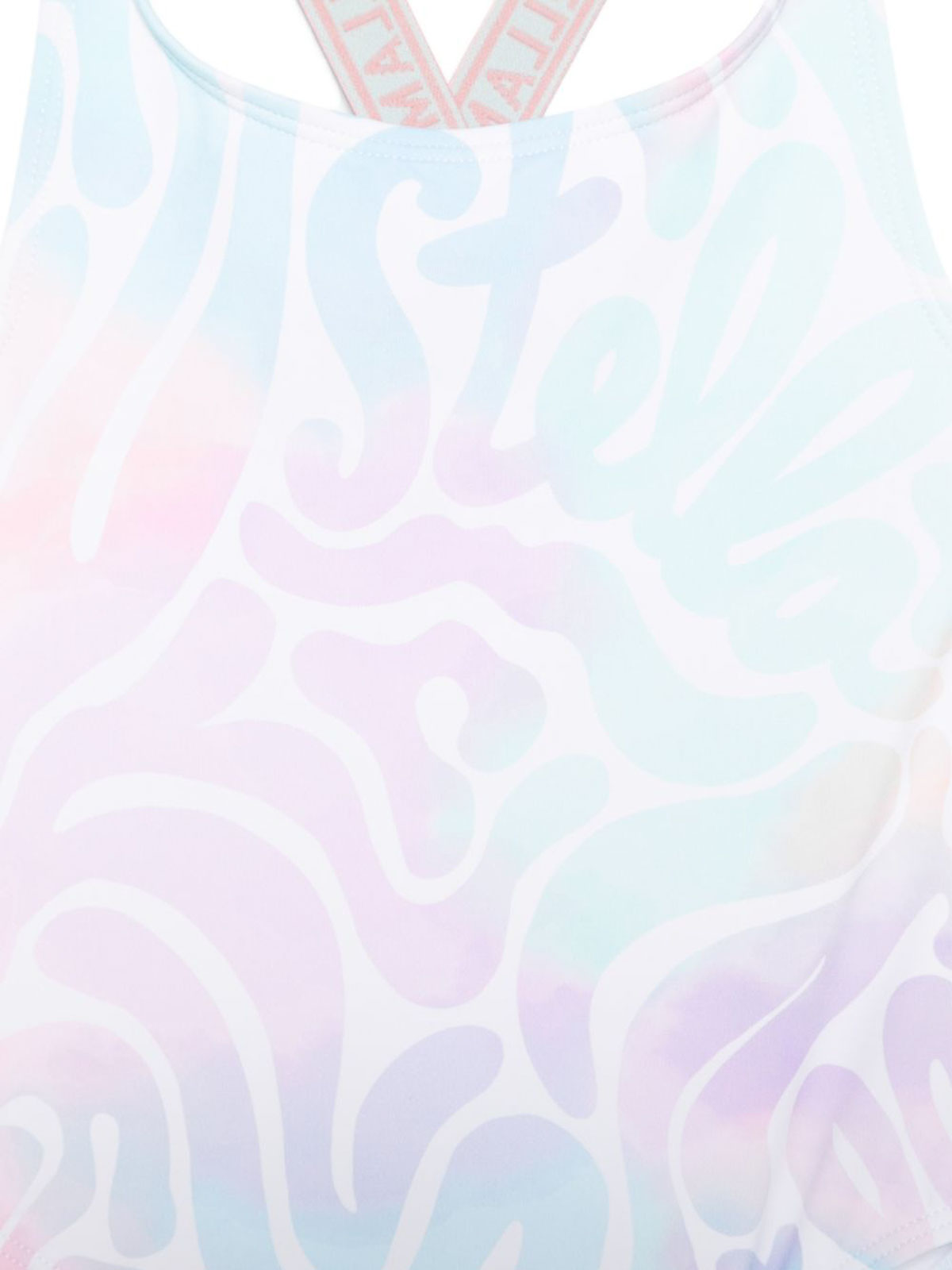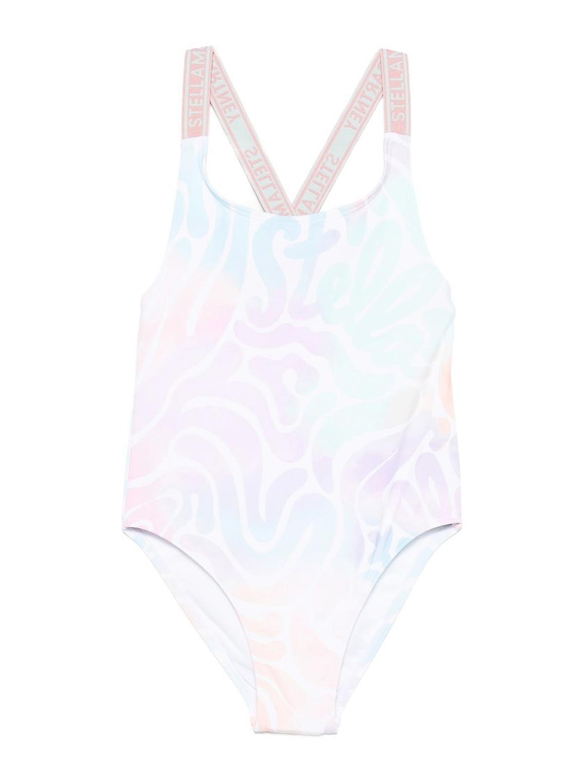 El traje de baño con estampado de logotipo presenta estampado de logotipo blanco/multicolor en toda la prenda, tirantes cruzados en la espalda, cuello redondo, sin mangas