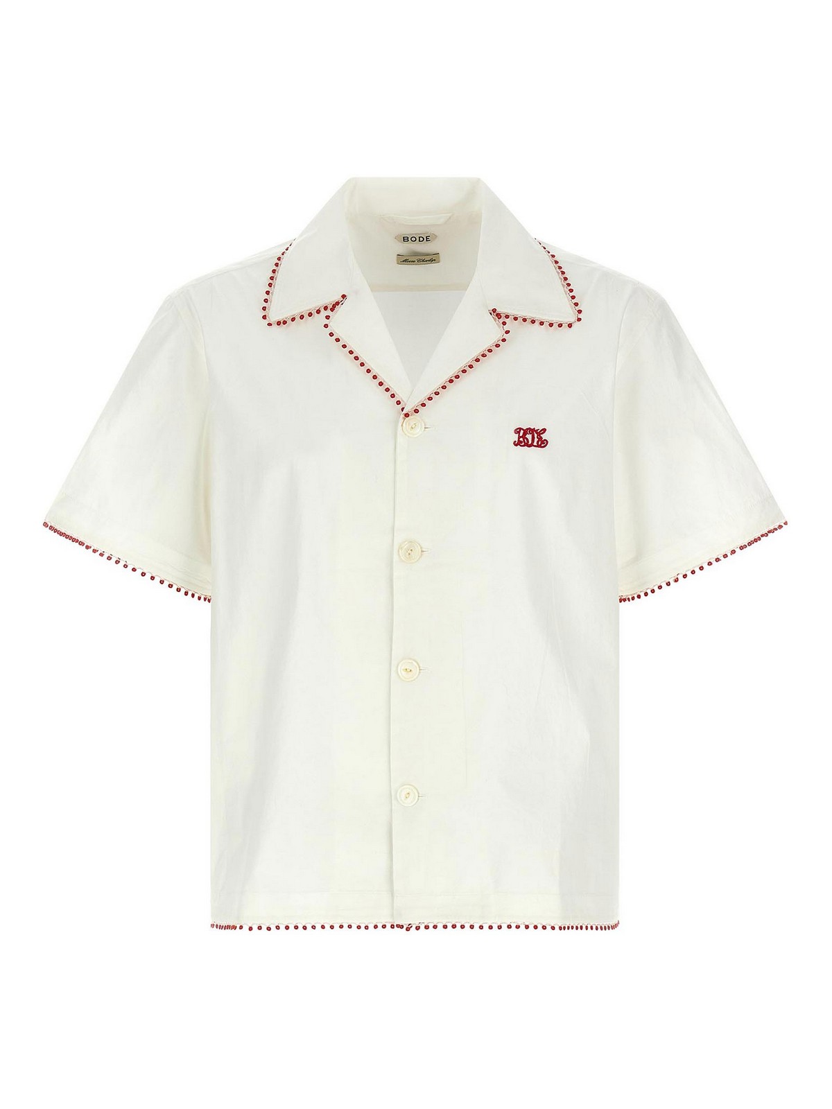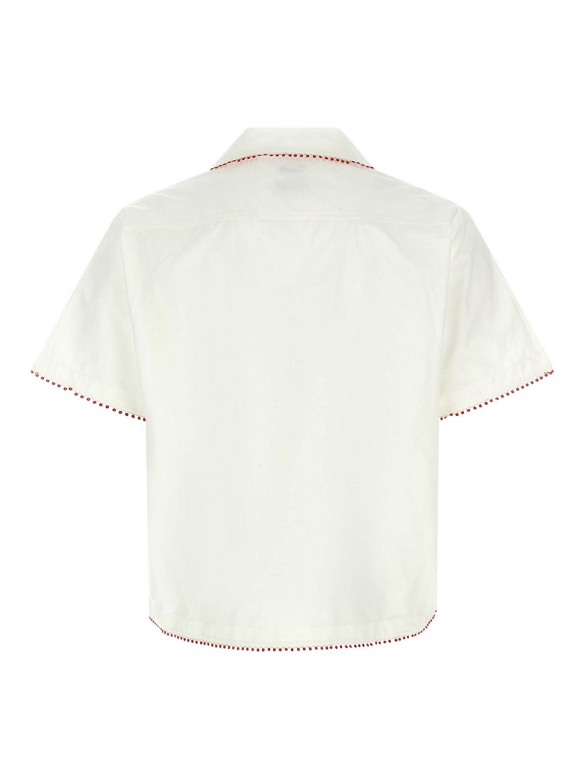 camisa redbud confeccionada en gasa de algodón ligera y acabada con ribetes de encaje en contraste, modelo bowling, logotipo bordado, cierre con botones en la parte delantera y manga corta.