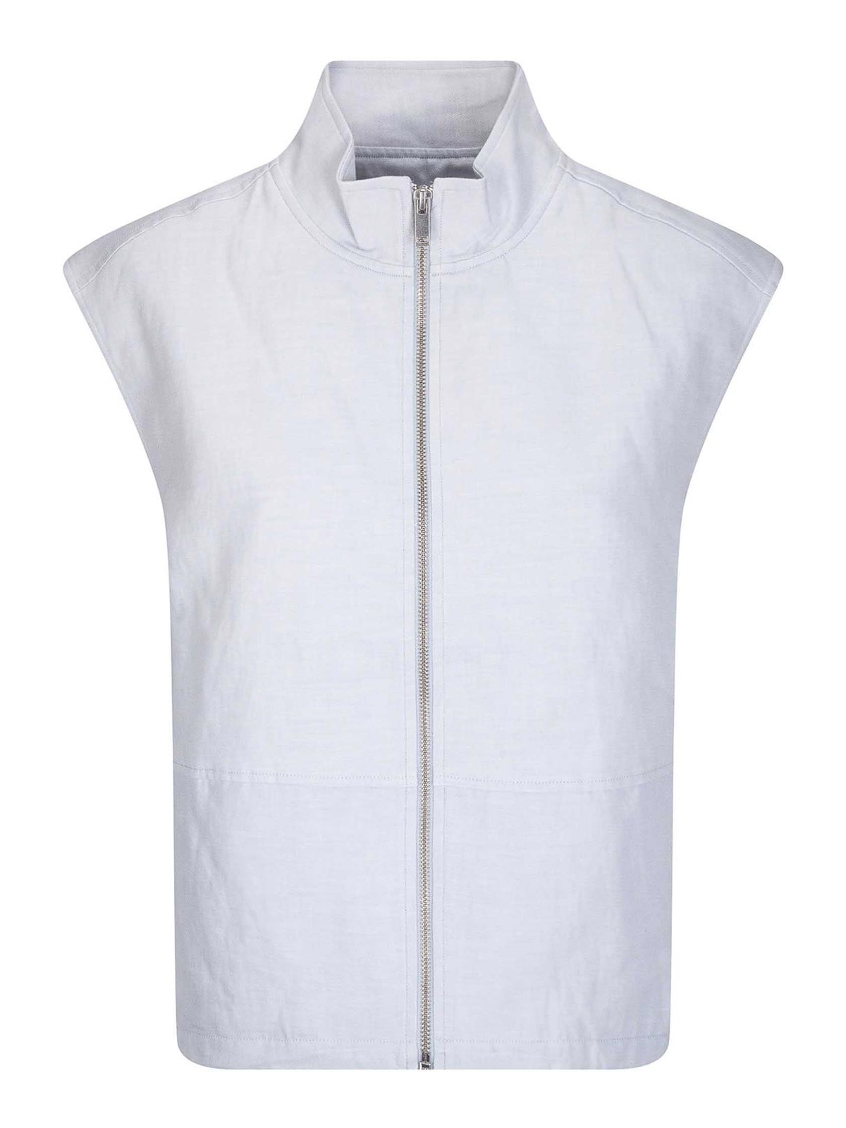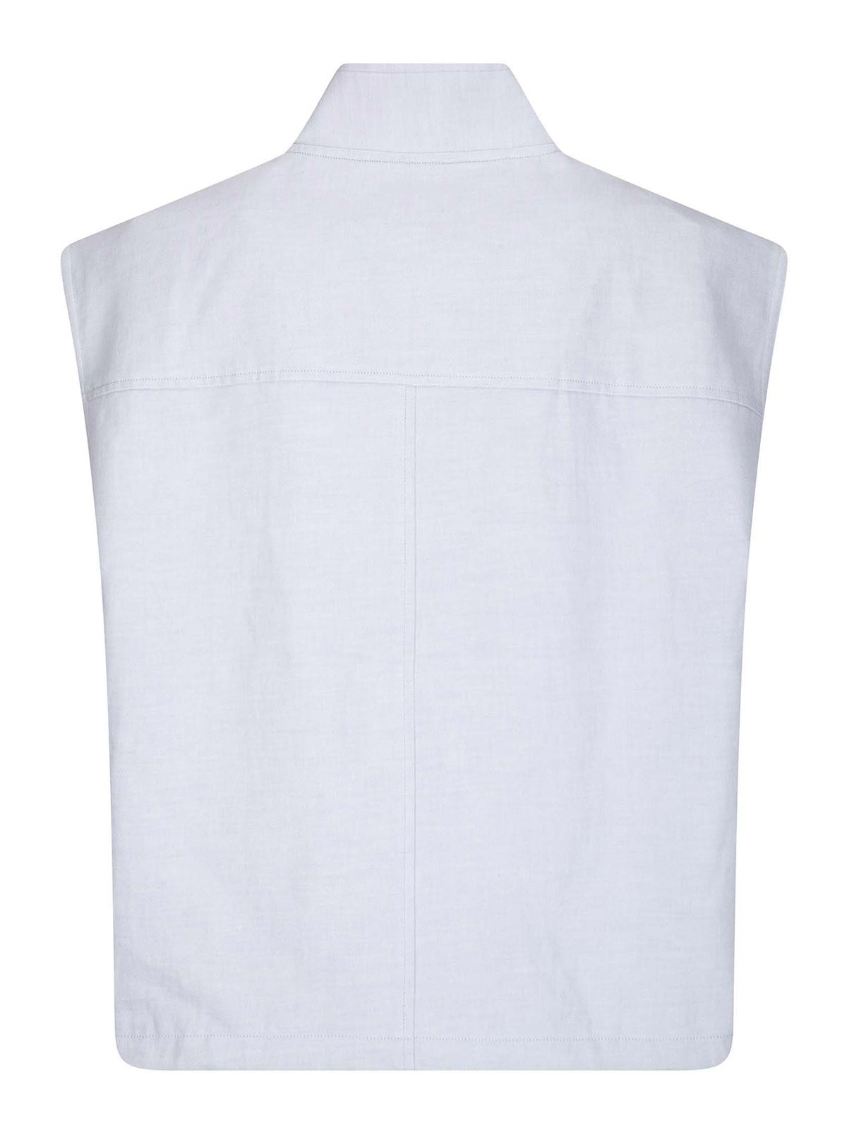 Chaleco de algodón orgánico y lino, cierre con cremallera, cuello alto, pinzas internas con encaje rápido.
