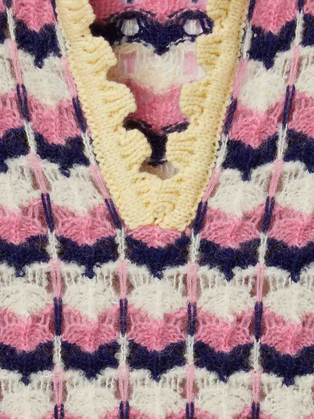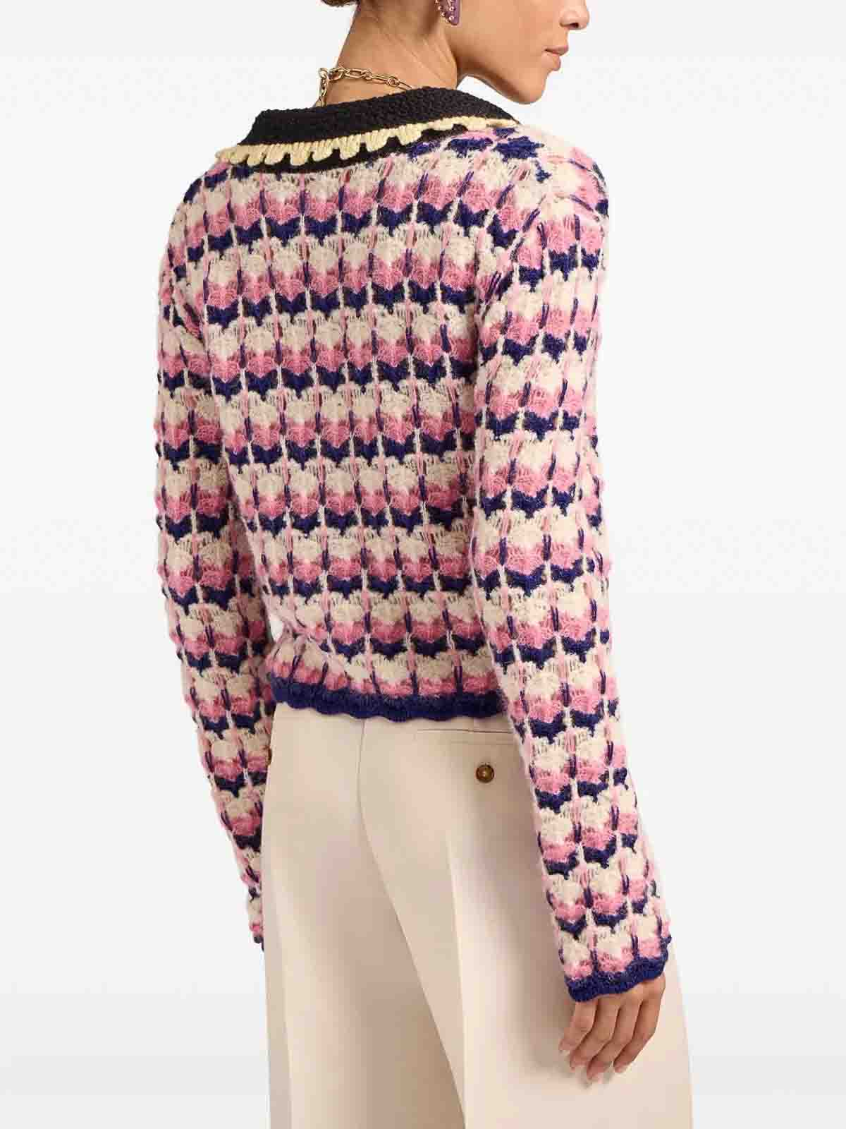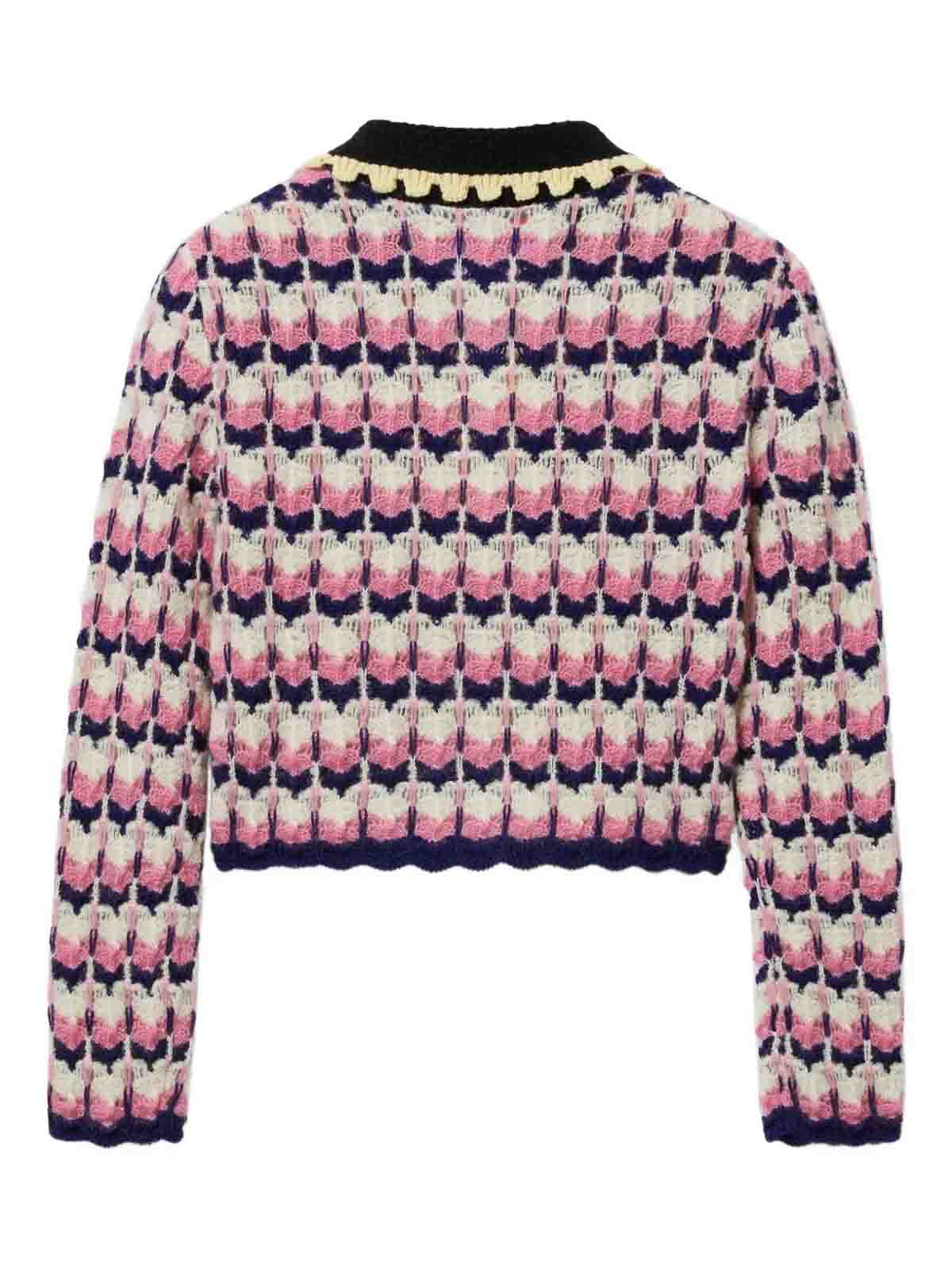 Diseño rosa/azul marino/rosa crudo, estampado geométrico multicolor, ribete de ganchillo, cuello en V, mangas largas, dobladillo acanalado