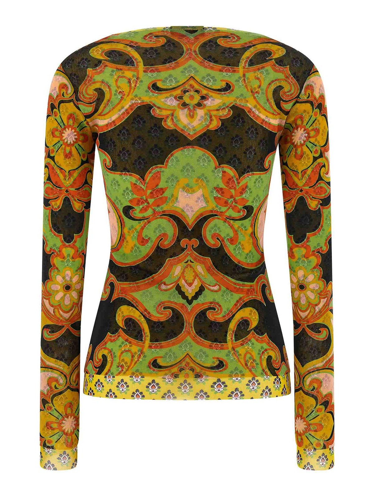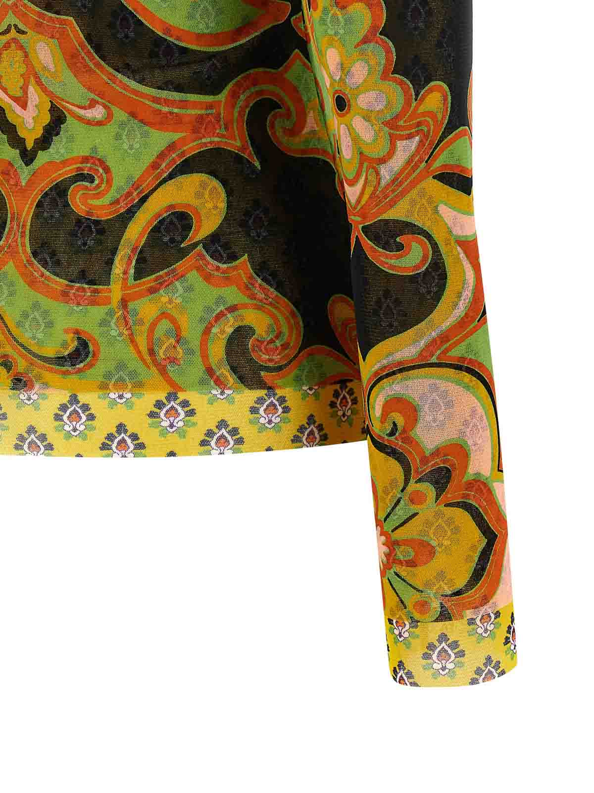 Patterned stretch mesh fabric sweater, double-layer insert stitched on the shoulders, round neckline, long sleeves, raw cut hem, and asymmetrical hem.