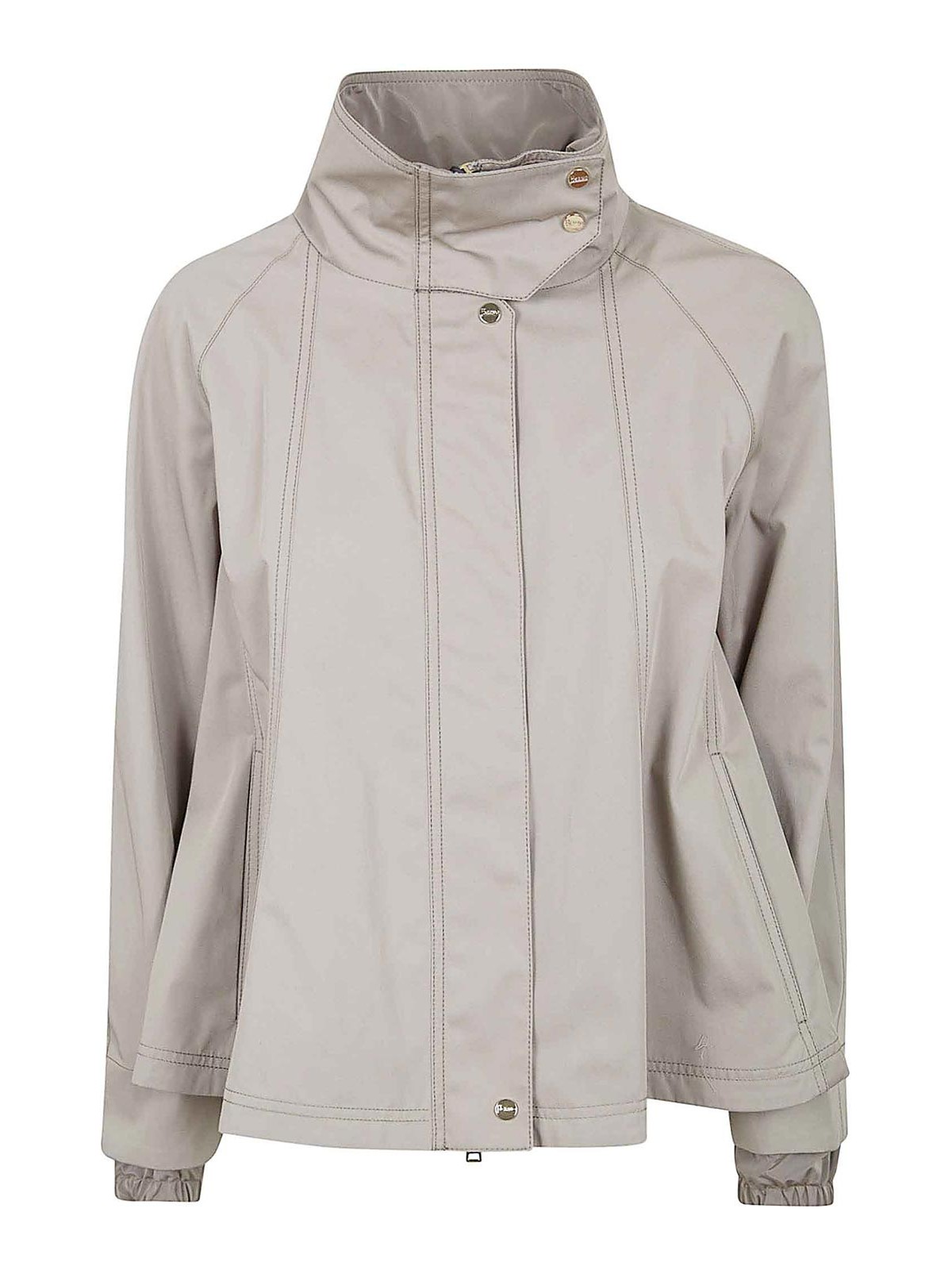 Gabardine cape with herno drip-proof finishing high collar long sleeves welt pockets with snap buttons and covered zip regular fit design that widens hem characterized by taffet and metal herno logo on the back