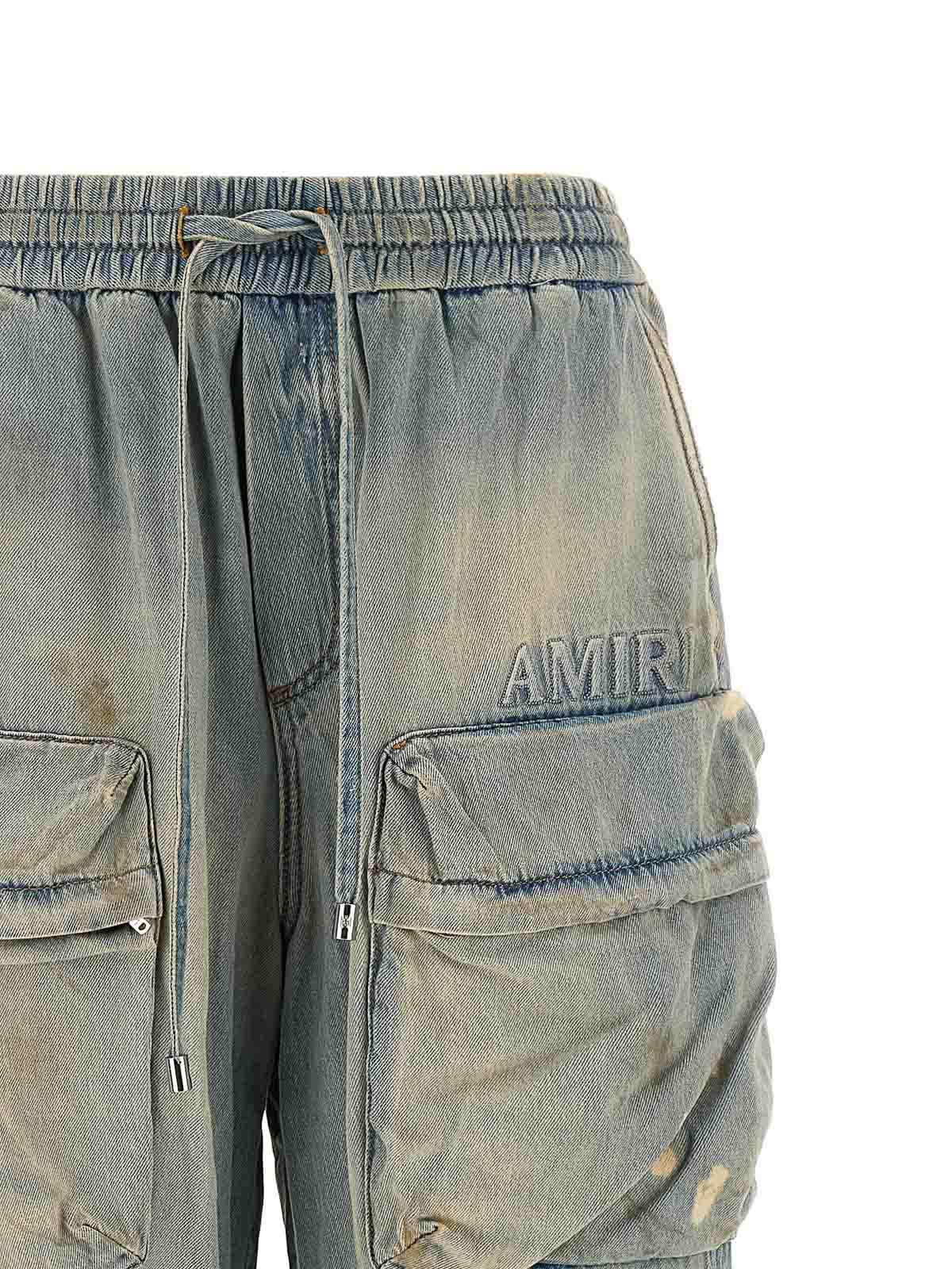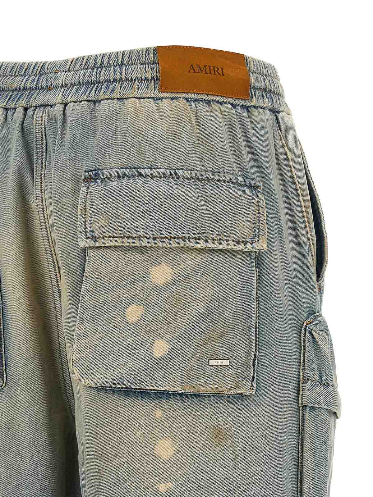 Jeans in denim di cotone stone washed con macchie di vernice invecchiata a mano, modello cargo con tasche, vita alta, ricamo logo 3d frontale, gamba ampia svasata, elastico in vita con coulisse, patta trompe l'oeil, pinces al ginocchio, fondo gamba con bottoni a pressione, etichetta logo posteriore. questo capo è stato sottoposto ad un processo speciale che ha dato come risultato variazioni intenzionali di tonalità e colori che aggiungono caratteristiche uniche al capo.