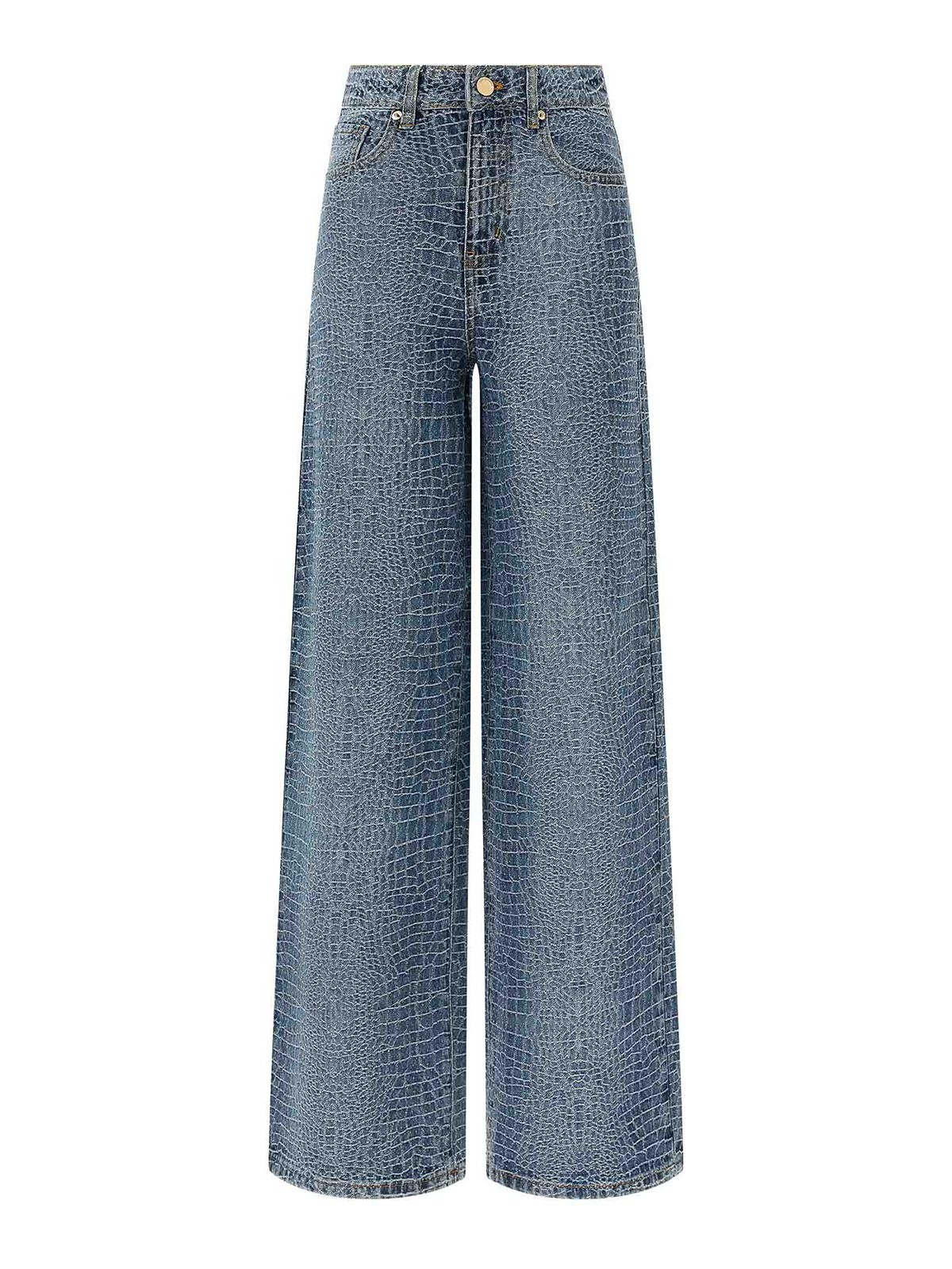 Jeans in denim di cotone 'strass' 'effetto coccodrillo' con applicazione di cristalli trasparenti all over e stampa a trama coccodrillo, modello a vita media, 5 tasche, gamba ampia e dritta, chiusura frontale con zip e bottone.