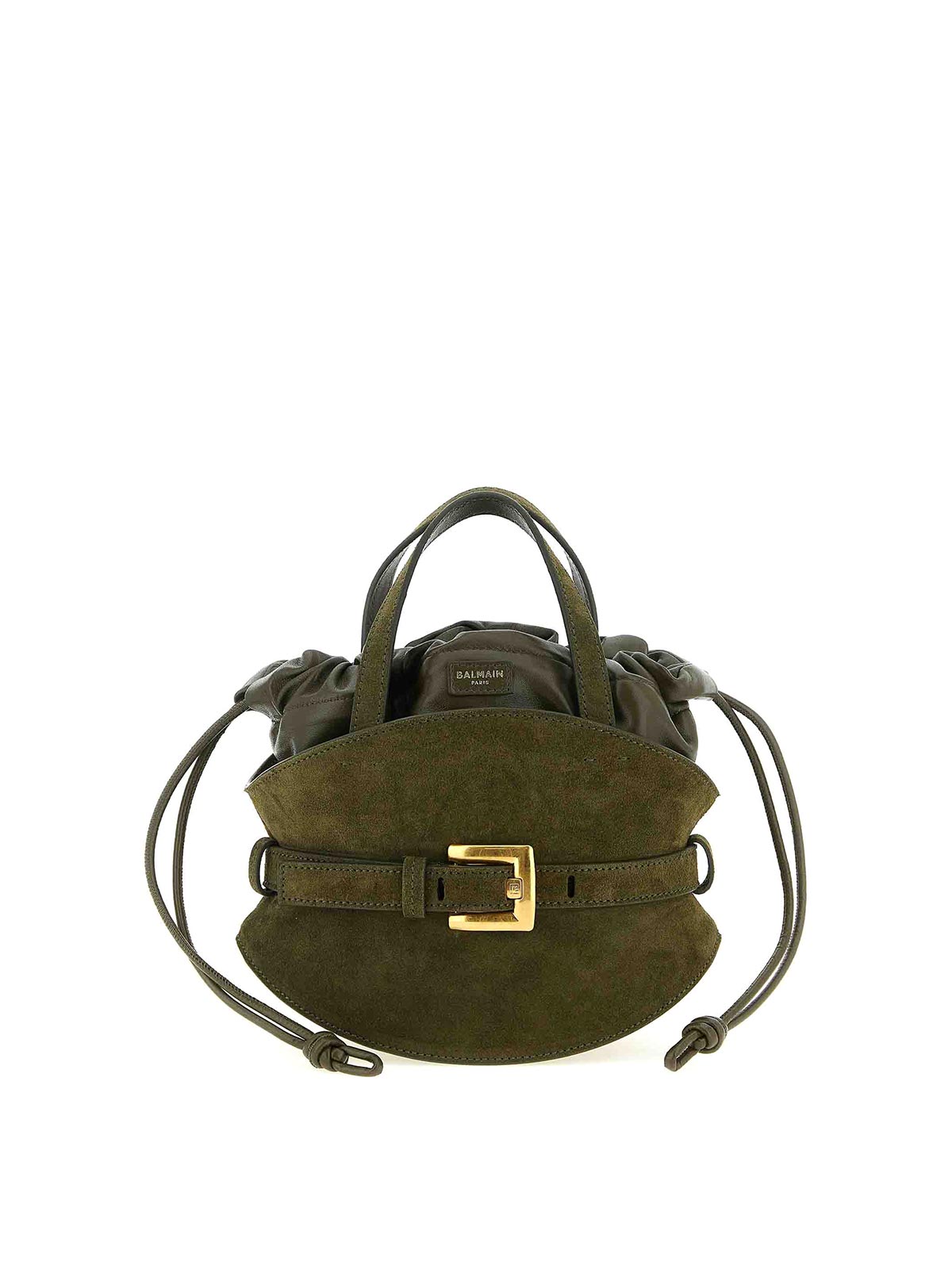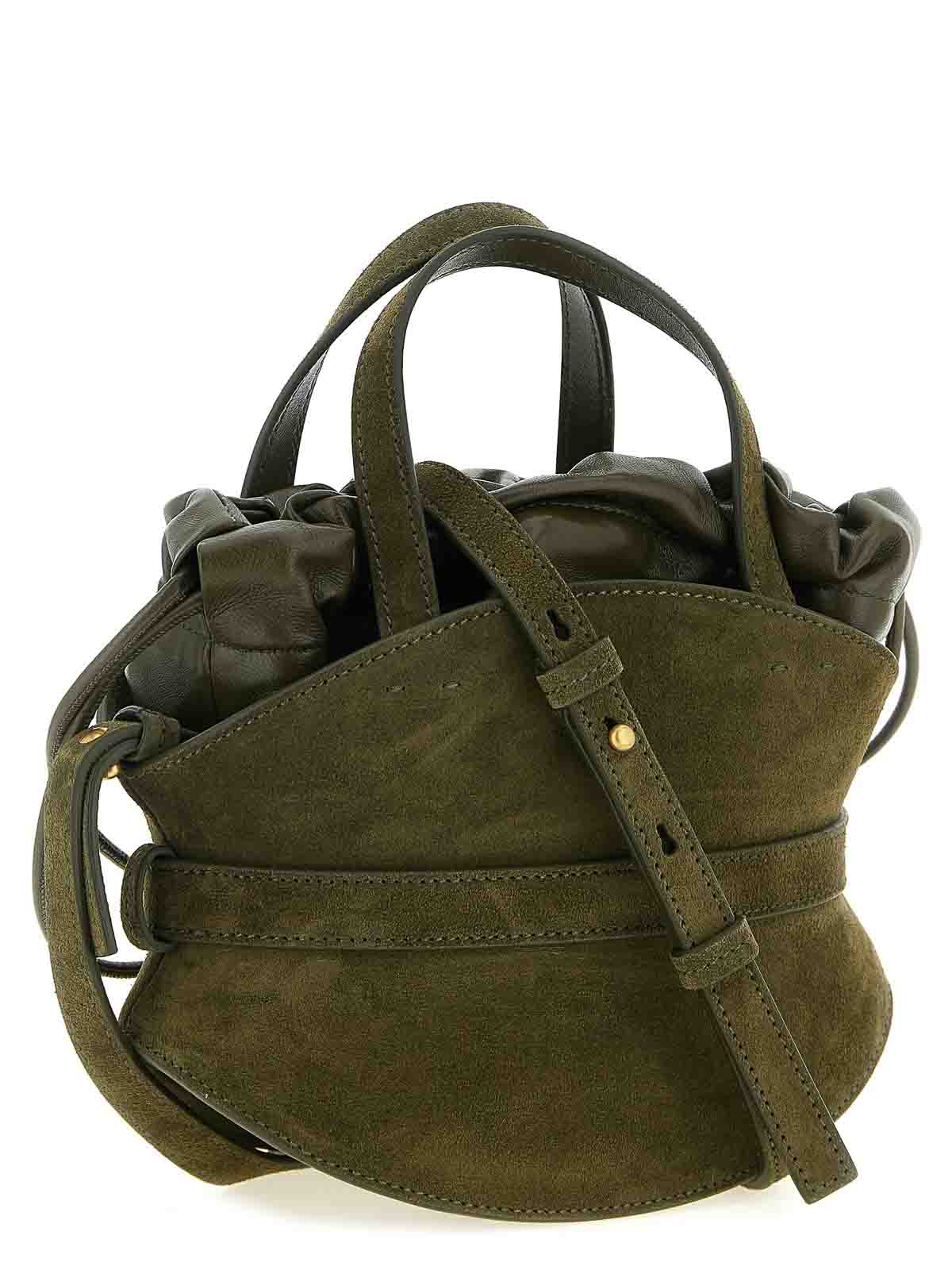 mini borsa a mano 'shuffle' in camoscio e pelle, cintura con fibbia 'anthem' in metallo anticato, doppio manico fisso, patch logo frontale, chiusura della borsa con coulisse, tracolla regolabile e removibile.