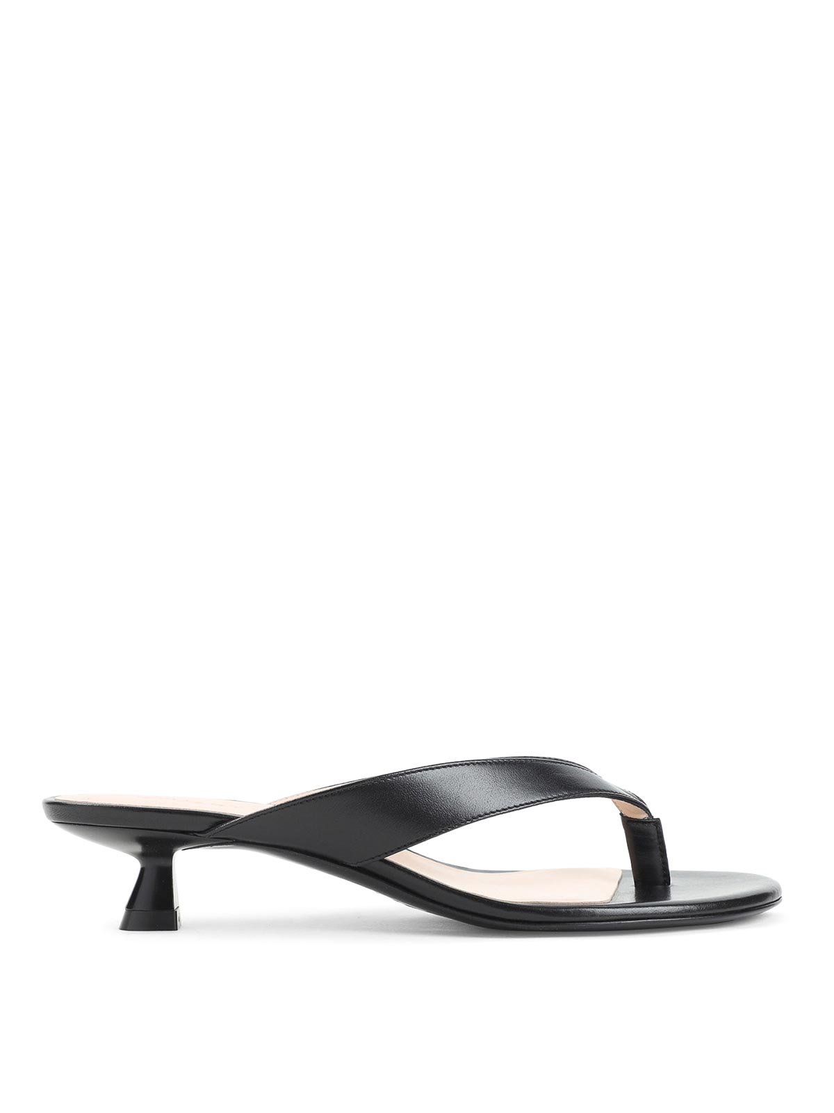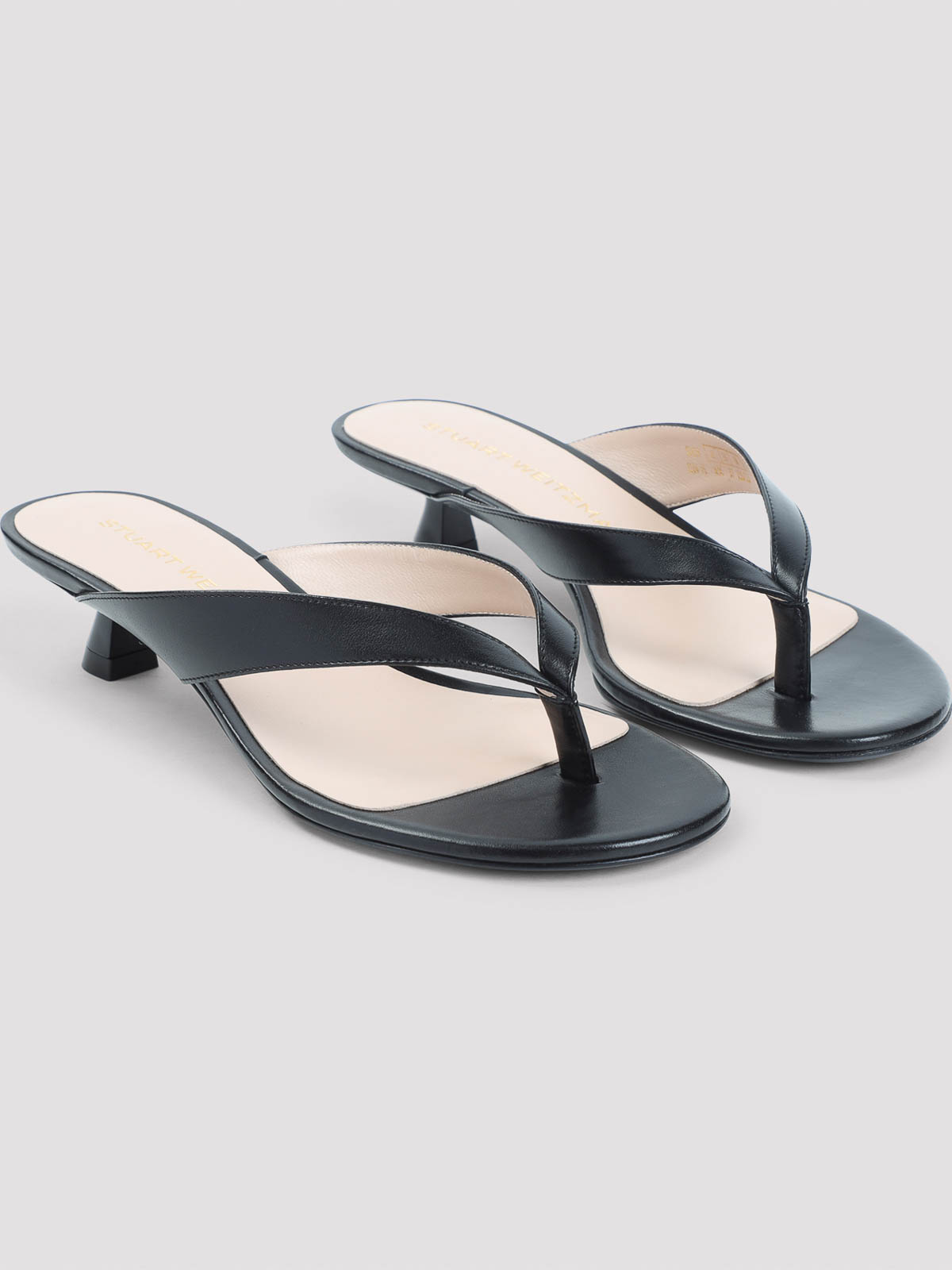 Sandali Stuart Weitzman Rio Gloss 35 in pelle di vitello nera. sandali in pelle di vitello nera, punta rotonda aperta, design infradito, cinturino in pelle tono su tono, stile slip-on, tacco sottile tono su tono, suola in cuoio tono su tono.