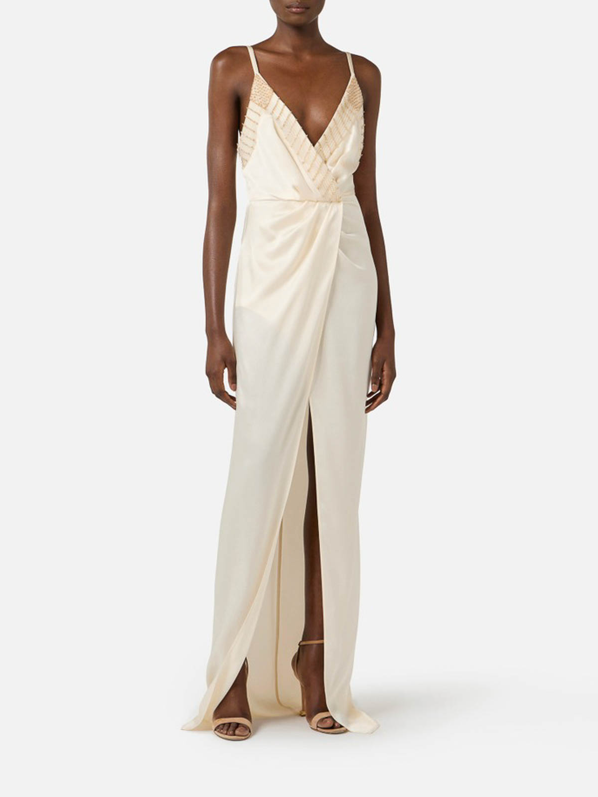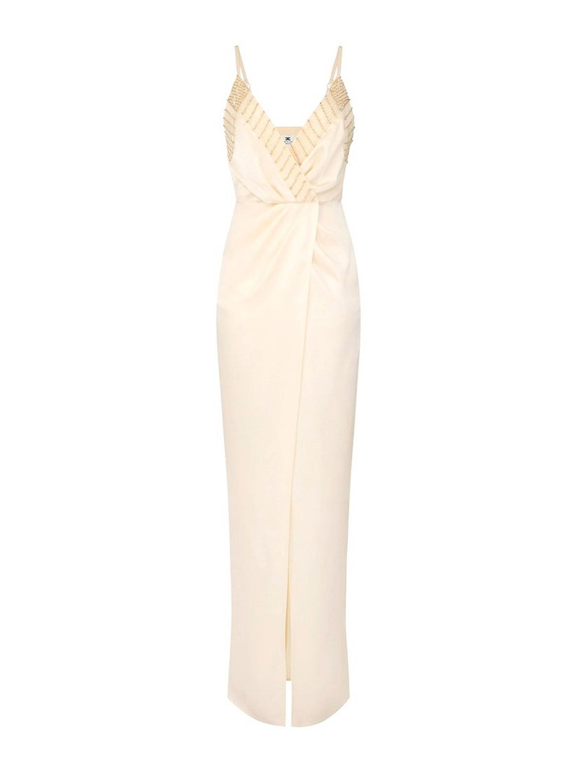 Abito da sera slim e aderente, l'abito presenta spalline sottili e ricami sulla scollatura con motivi geometrici che aggiungono brillantezza e simmetria, la gonna avvolgente si apre in uno spacco centrale, spalline regolabili, bottoni automatici in maglia.