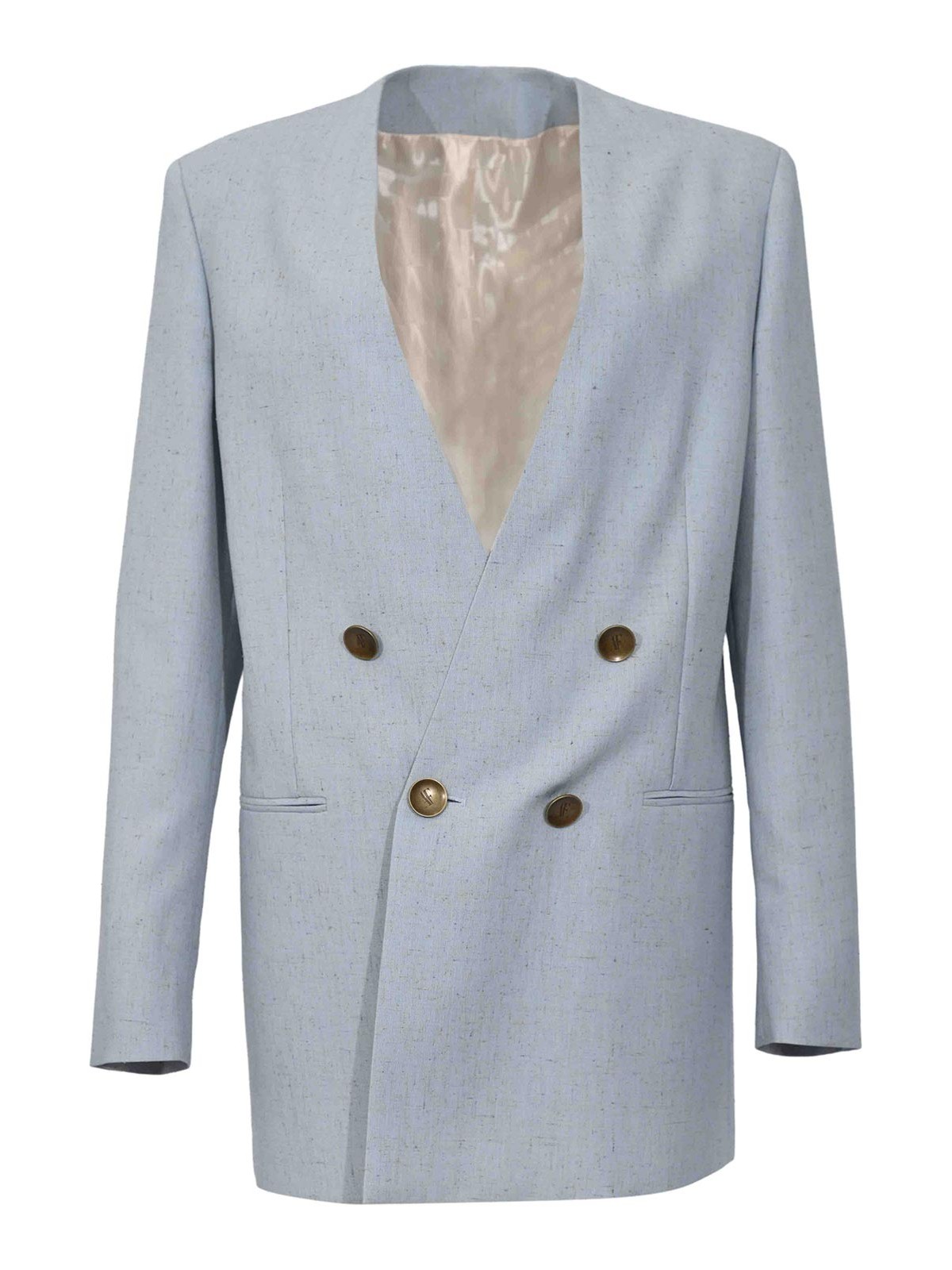 ビスコースとシルク混紡の女性用ダブルブレストジャケット、Alberta Ferretti、モデル、生地:ビスコースとシルク混紡、パターン:無地、袖:ロング、襟:襟元:襟なし、Vネック、クロージャー:フロントボタン付きダブルブレスト、ポケット:フロントウェルト、ディテール:ロゴが刻印されたメタルボタン、袖の底に通気口、裏地:S、フィット:レギュラー