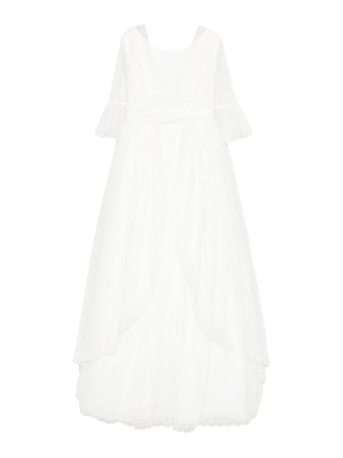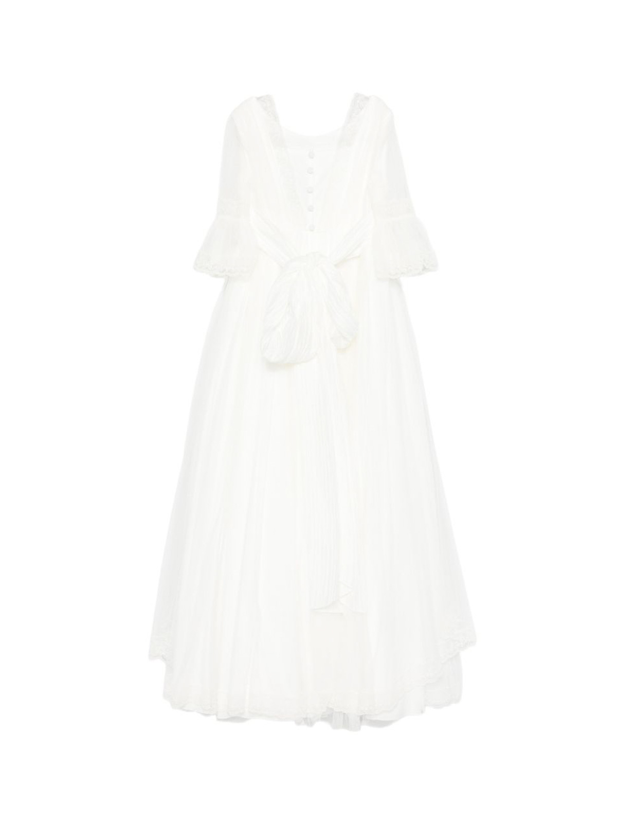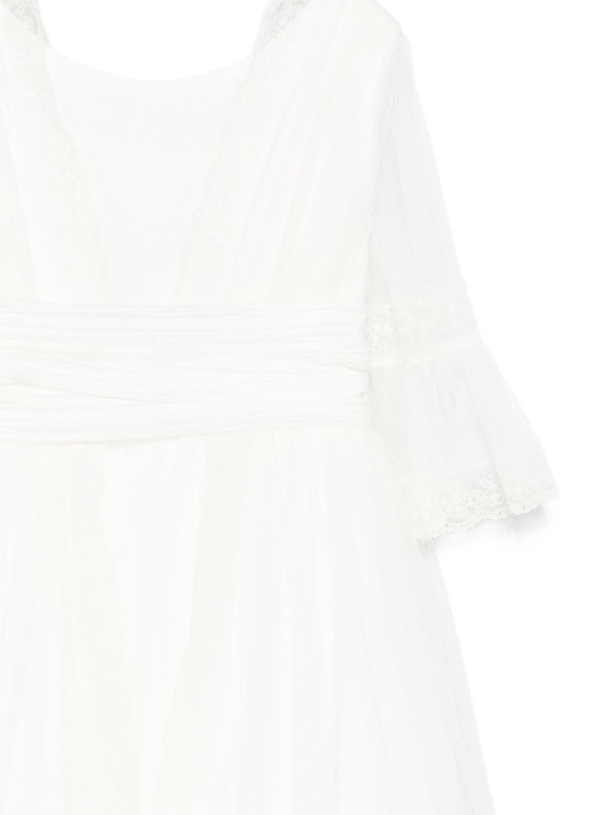 リボンスリーブ付きクリームレーストリム/ティアードデザインが特徴のリボンドレス