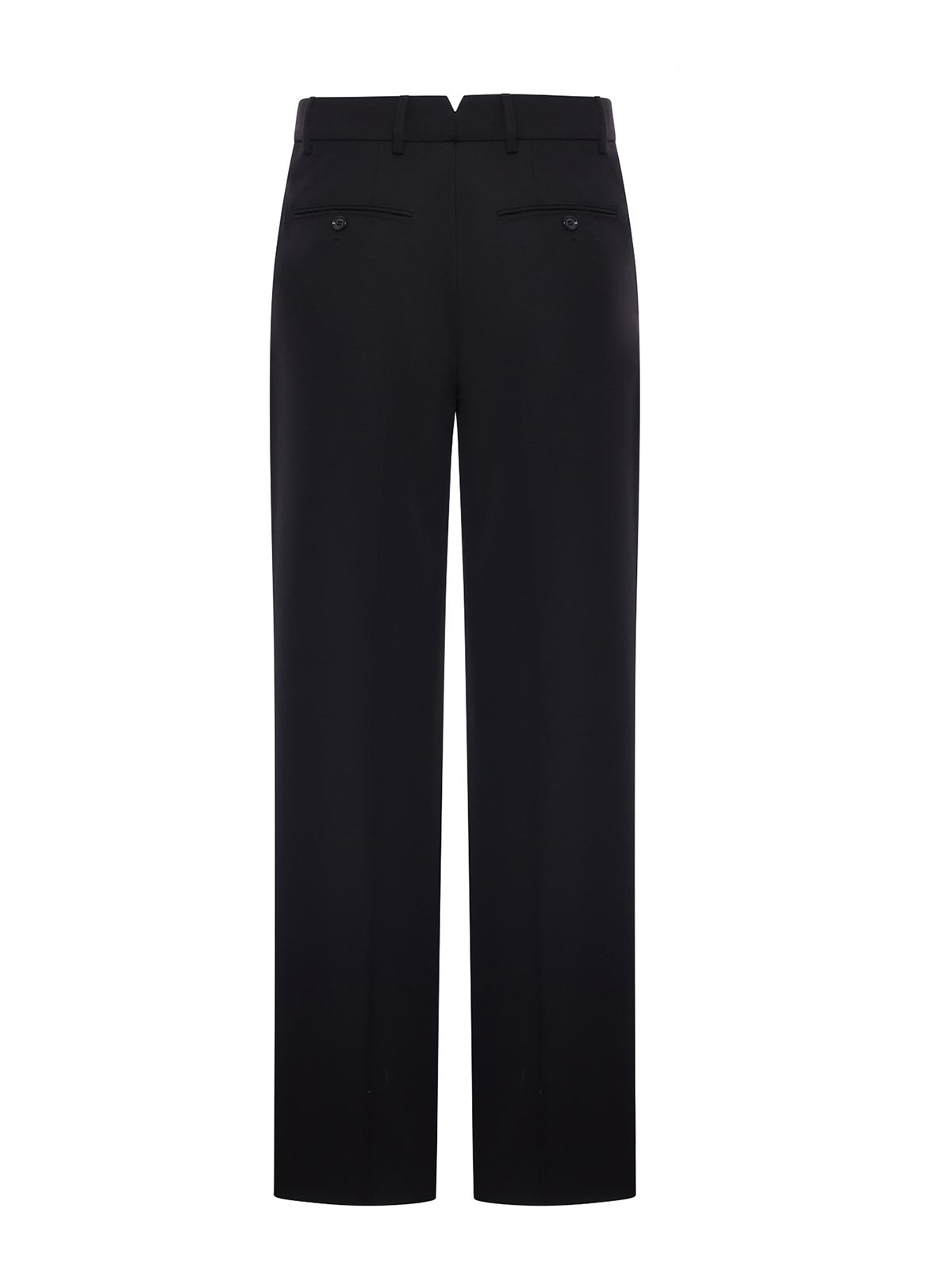 隠しファスナーと内部フック付きのフロントクロージャー、ベルトループ付きウエスト、フィット感とドレープ性を高めるフロントプリーツ、フロントに斜めのサイドポケット、ボタン付きバックウェルトポケット、ストレートレッグ、クラシック仕上げ、滑らかな手触りの滑らかでコンパクトな生地、すっきりとした補強された縫い目による正確な構造、レギュラーできれいなシルエットのストレートフィット、100% ウール、色:ブラック