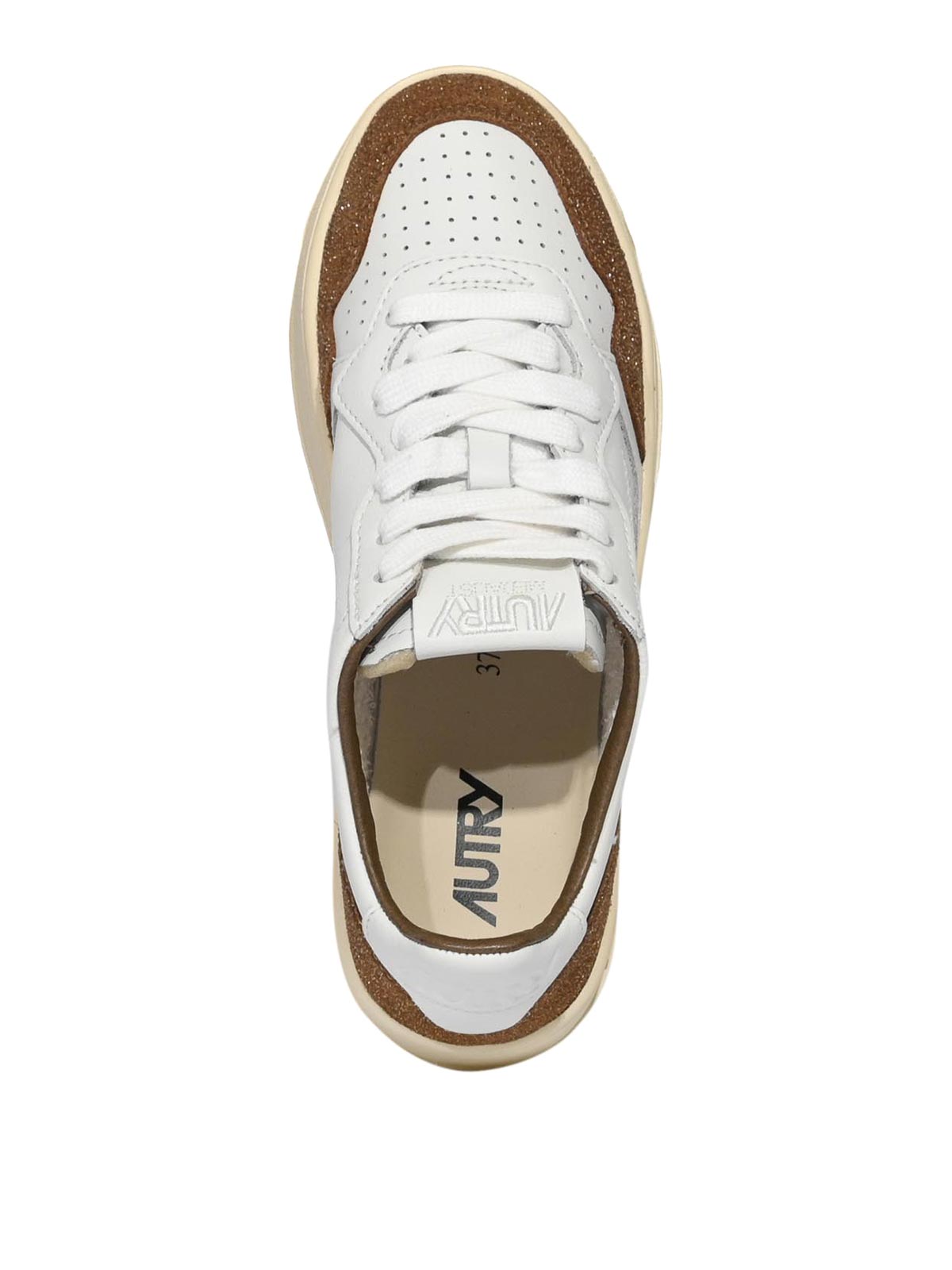 レザーとグリッタースエードの女性用スニーカー、オートリー、メダリストプラットフォームモデル、アッパー:キラキラ光るスエードのインサートが付いた滑らかなレザーで、明るく現代的な外観になっています。クロージャー:ファブリックレース、ソール:快適さと安定性を保証するラバープラットフォーム、ディテール:ラテラルオートリーのロゴ、穴あきつま先、かかととつま先にグリッターインサート、裏地:スポンジとレザー、ヒール:ハイ&インテグレーションプラットフォームソールにインソール、インソール:レザーを2cm上げた状態