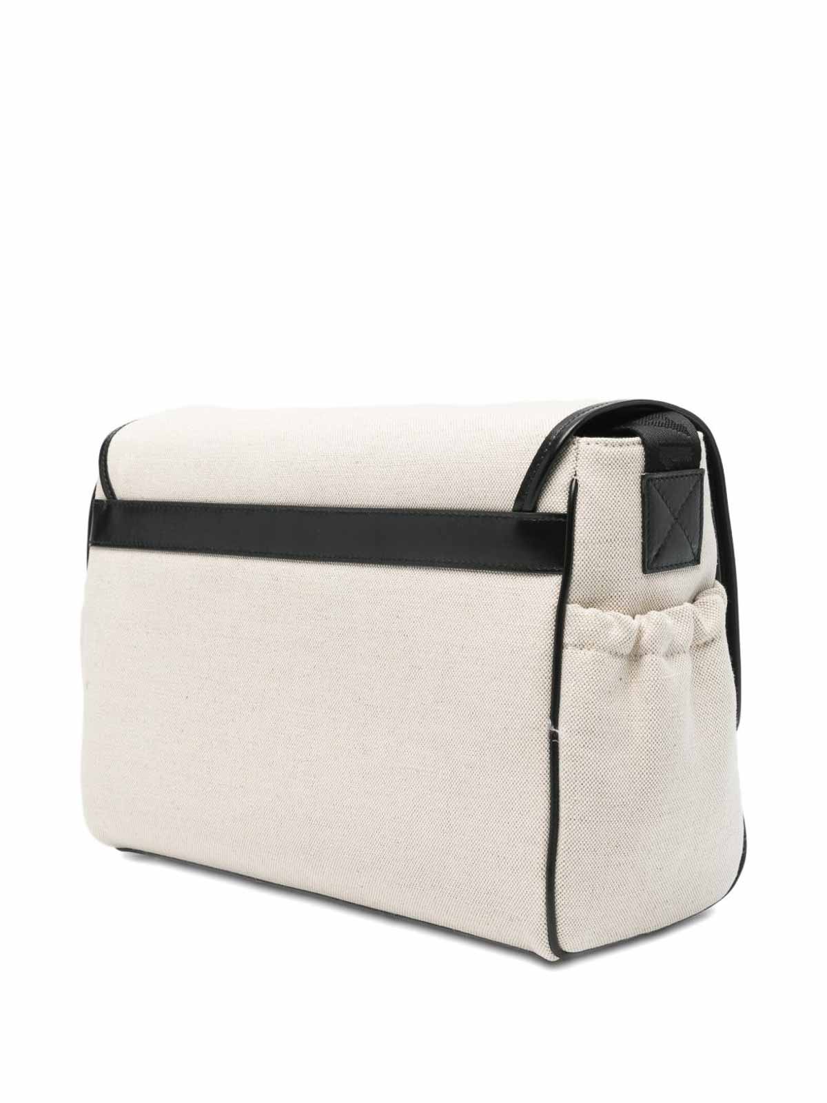 ライトベージュのロゴチェンジングバッグ、ロゴエッジと調節可能なベローズポケット付き