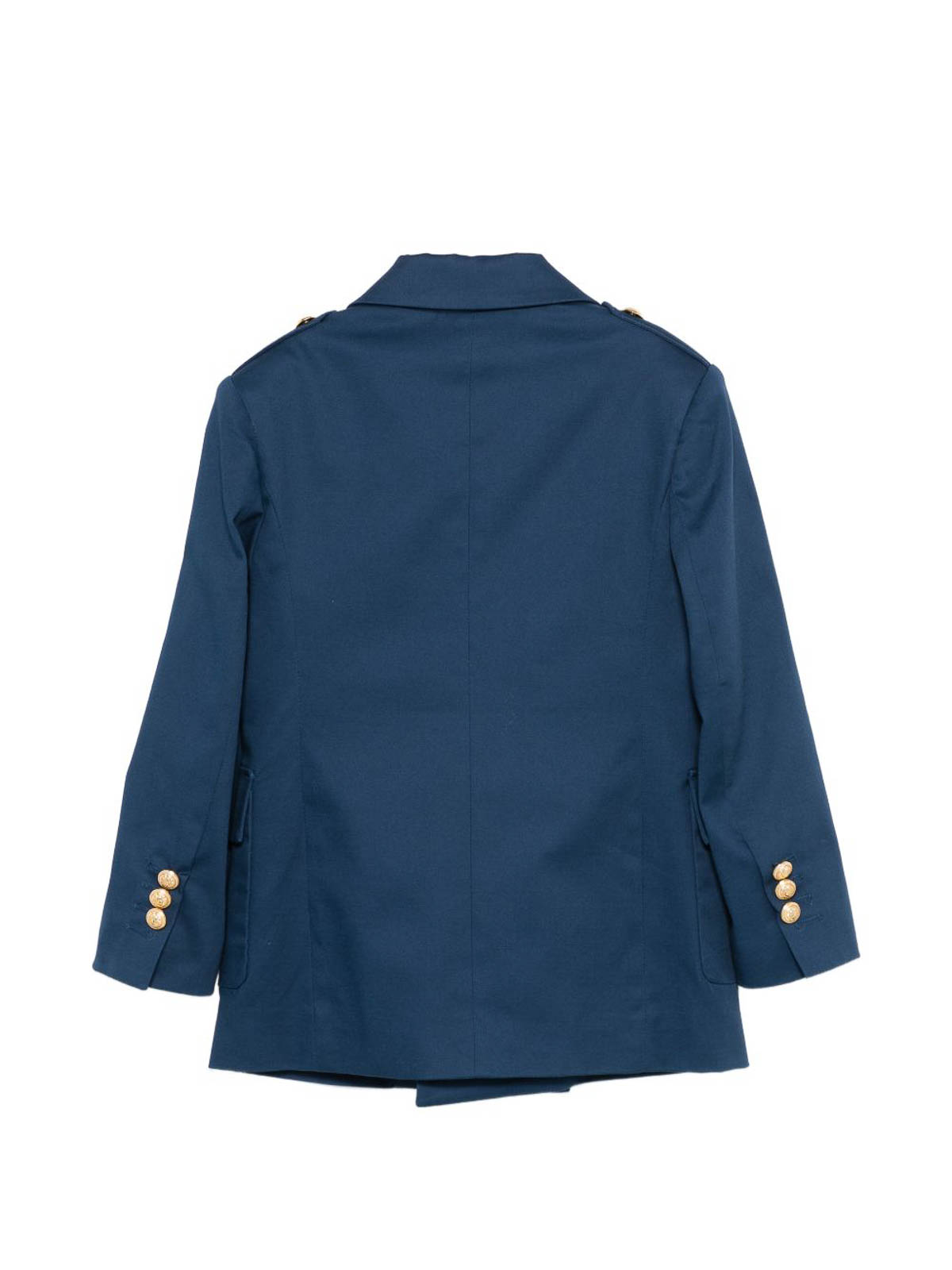 ボタン付きのダブルブレストジャケットは、青いダブルブレストのボタン、エポレット、パッチポケット、ボタン付きの裾が特徴です。