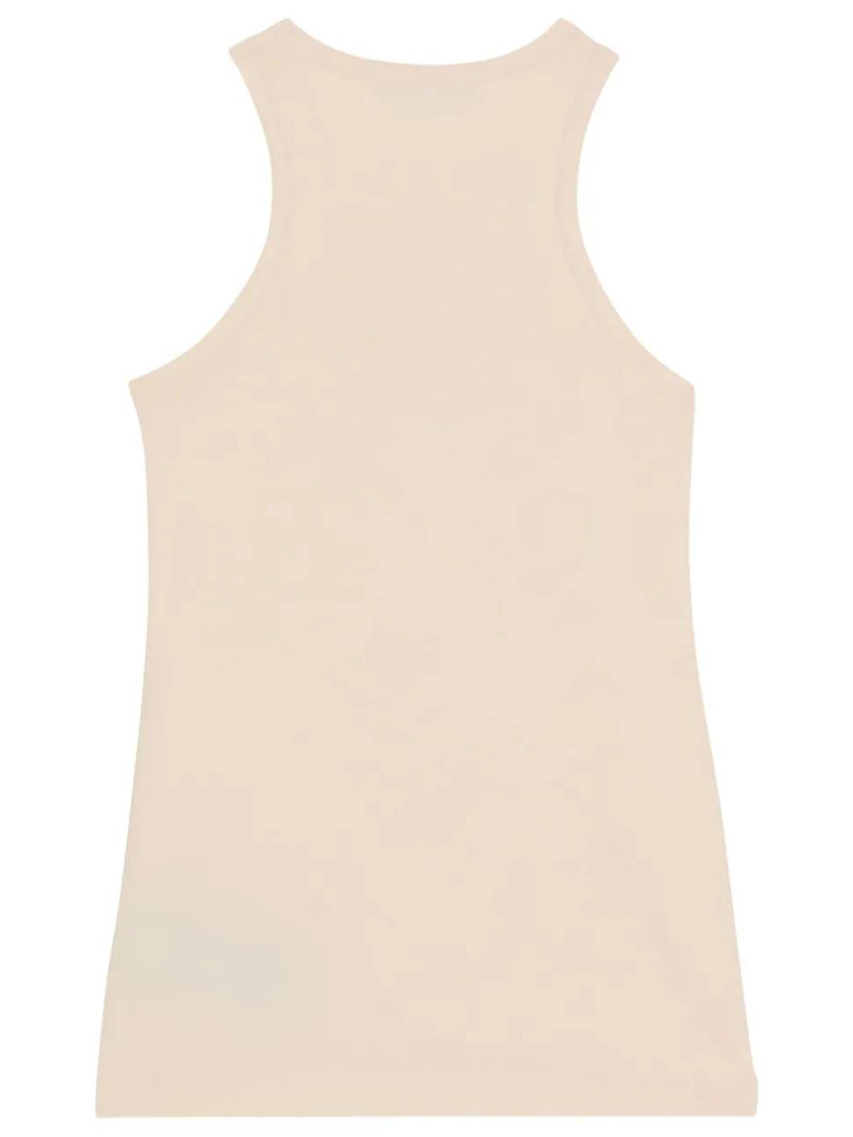 プリントされたタンクトップはベージュのノースリーブプリントデザインが特徴です