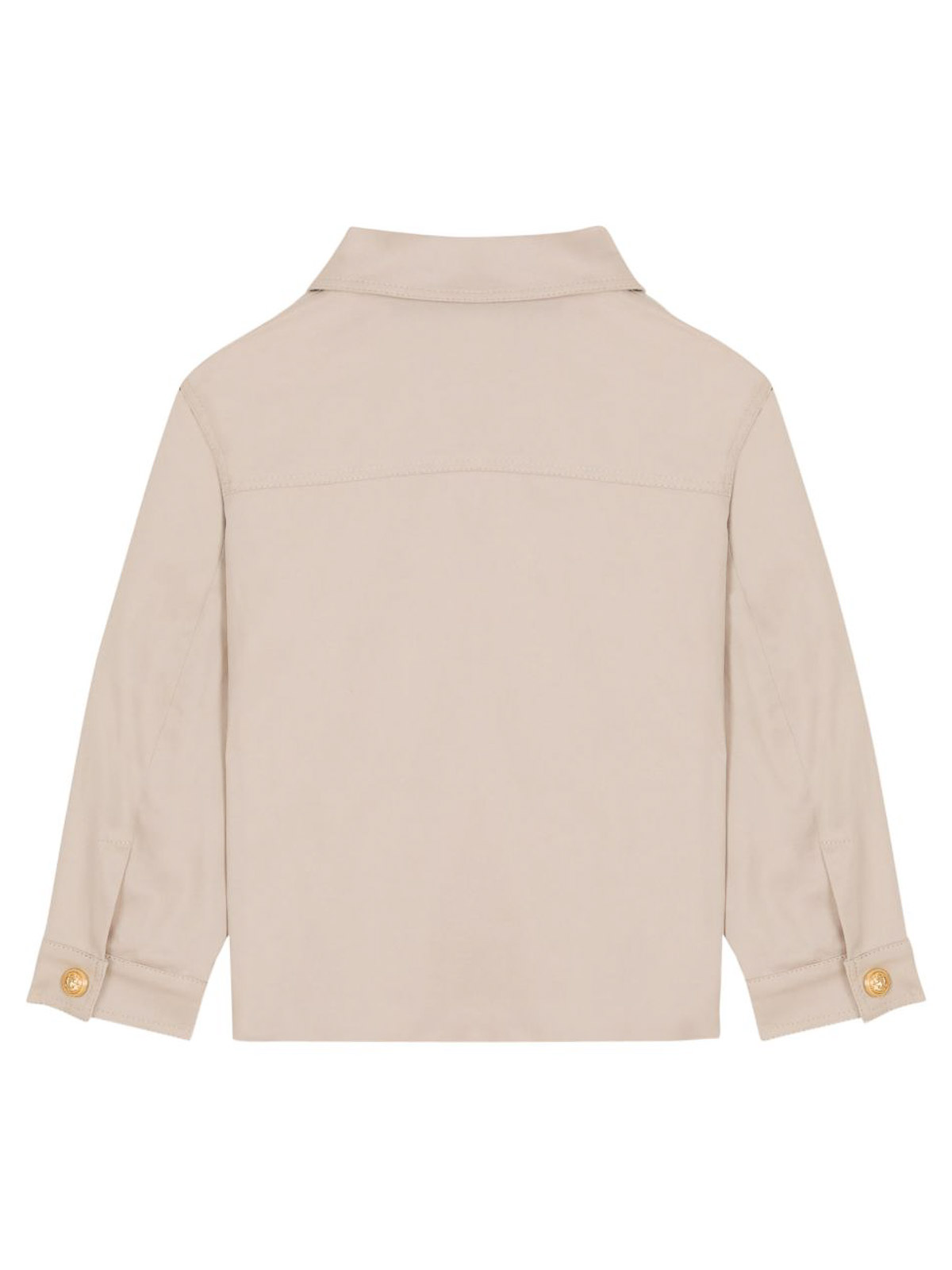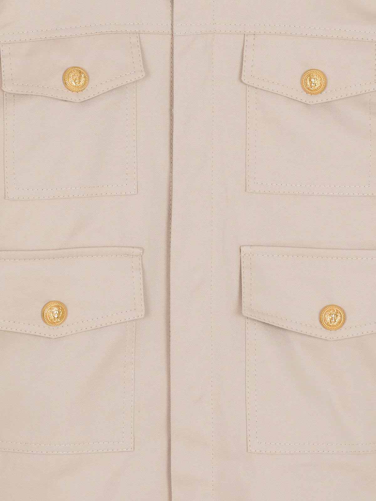 ベージュのフィーチャーポケット、ボタン付き胸ポケット、ポインテッドカラー、ロングスリーブ、ボタン付きヘム付きジャケット