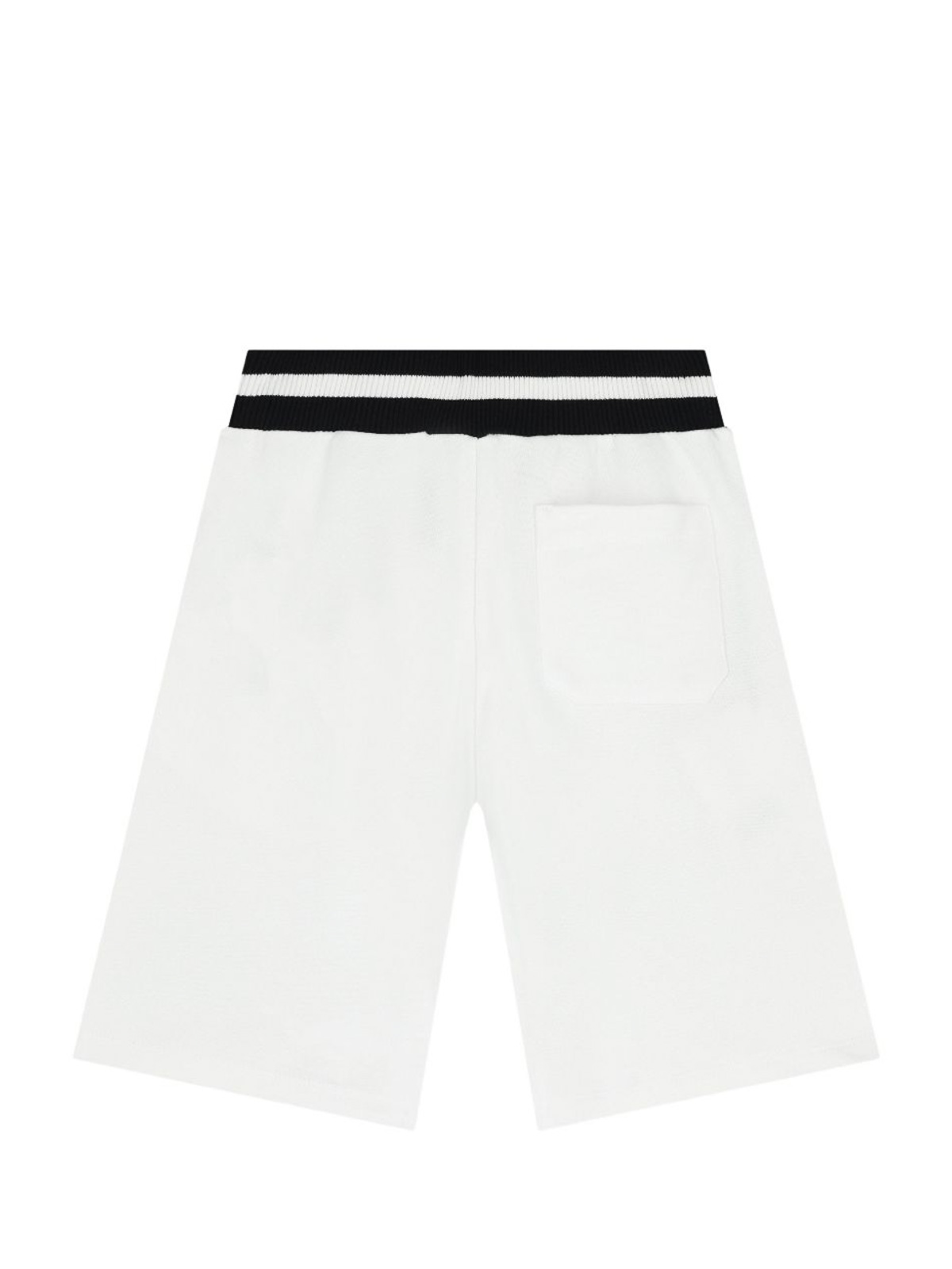 バミューダショーツ、白いロゴ、伸縮性のあるウエスト、ウェルトポケット、前面にロゴがプリントされています