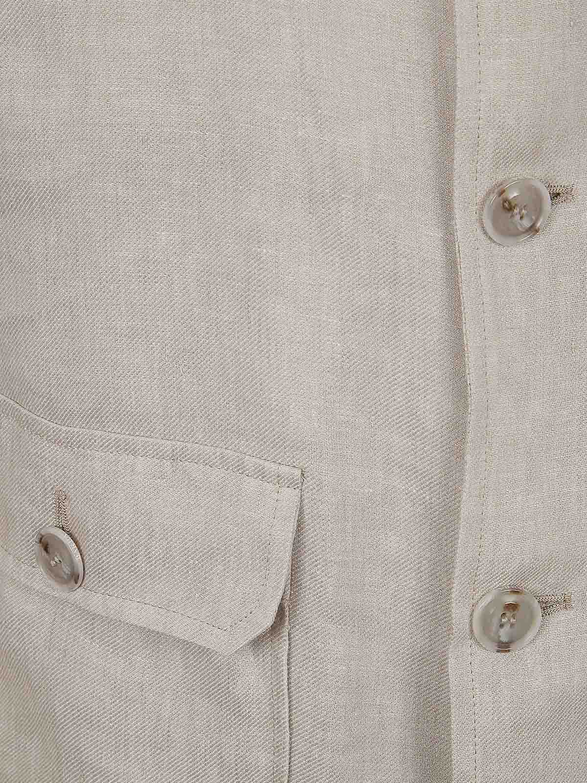Barb Napoli リネンジャケット、裾にリブ編みのゴムをあしらったハイカラー、トーン・オン・トーンのボタンが付いたカフス、フラップとボタン付きのパッチポケット2つ、レギュラーフィットデザイン