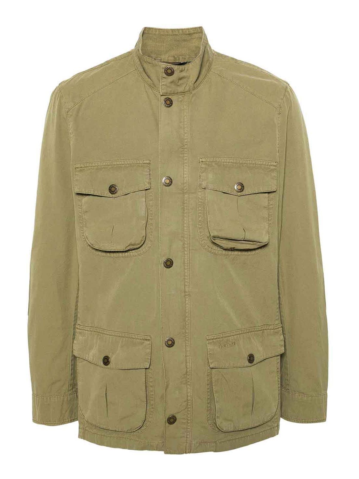 Barbourのオリーブグリーンのコットンジャケット。後ろにロゴパッチがあしらわれています。ハイネックフロントのプレススタッズ留め。隠しフロントファスナー。隠しフロントファスナー。ロングスリーブ。スナップボタンで留めるカフス。複数のカーゴポケット。裏地なし。