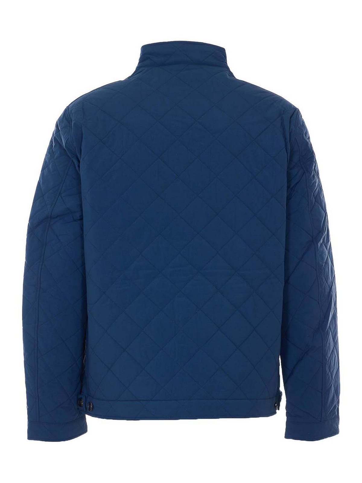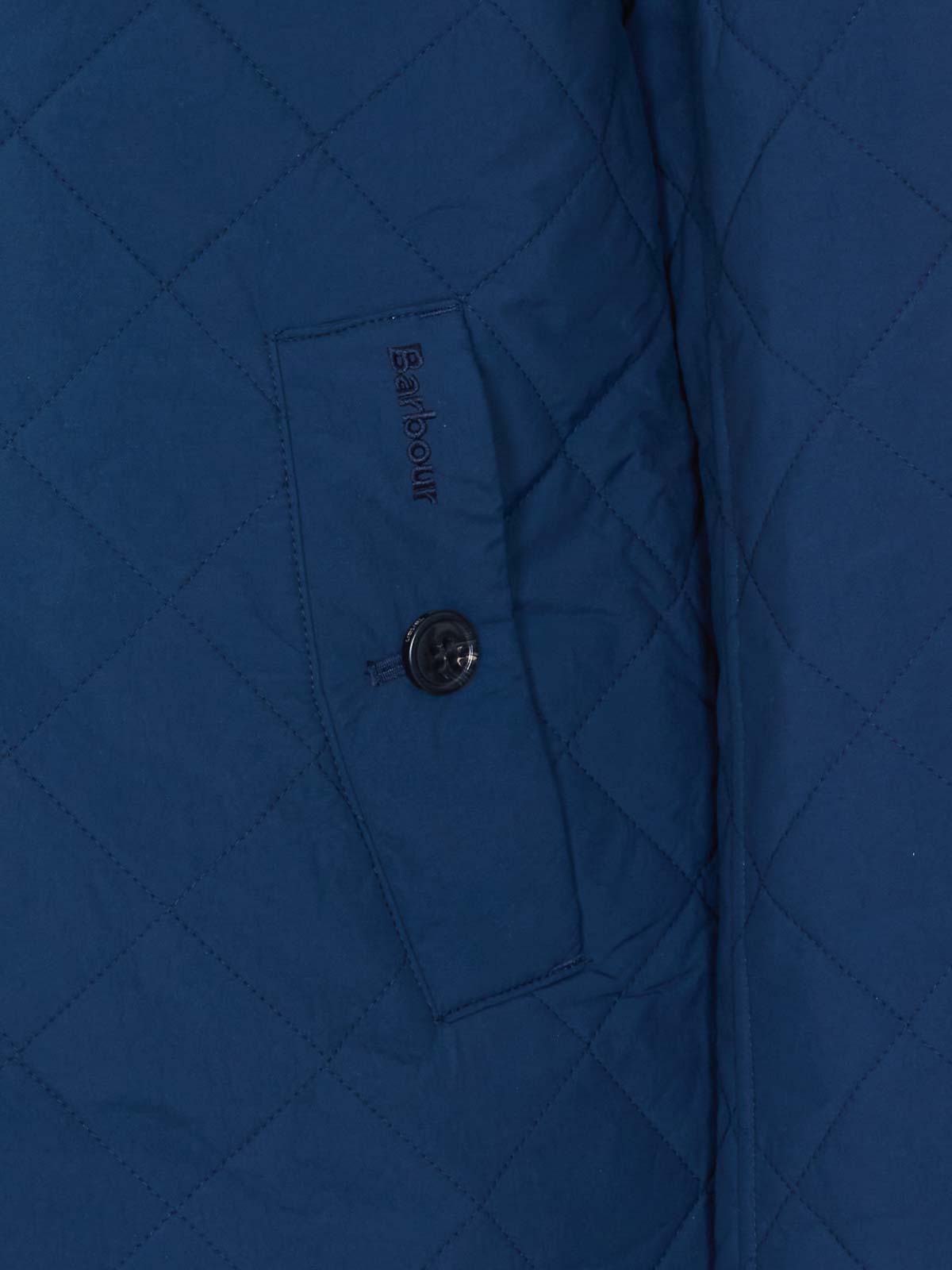 バーバーブルータインサイドキルトジャケット、ファスナー開閉、ハイネック、ボタン留め付きハイネック、長袖、ボタン留め付きポケット、前面にロゴ刺繍