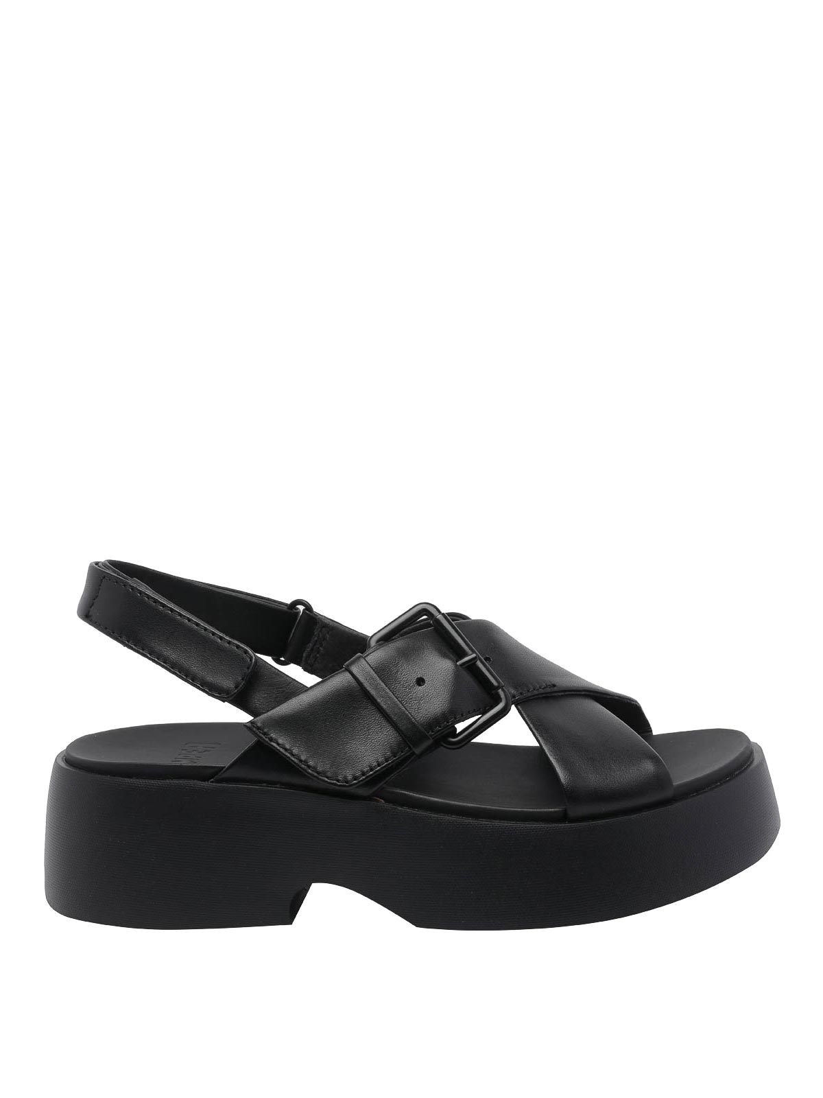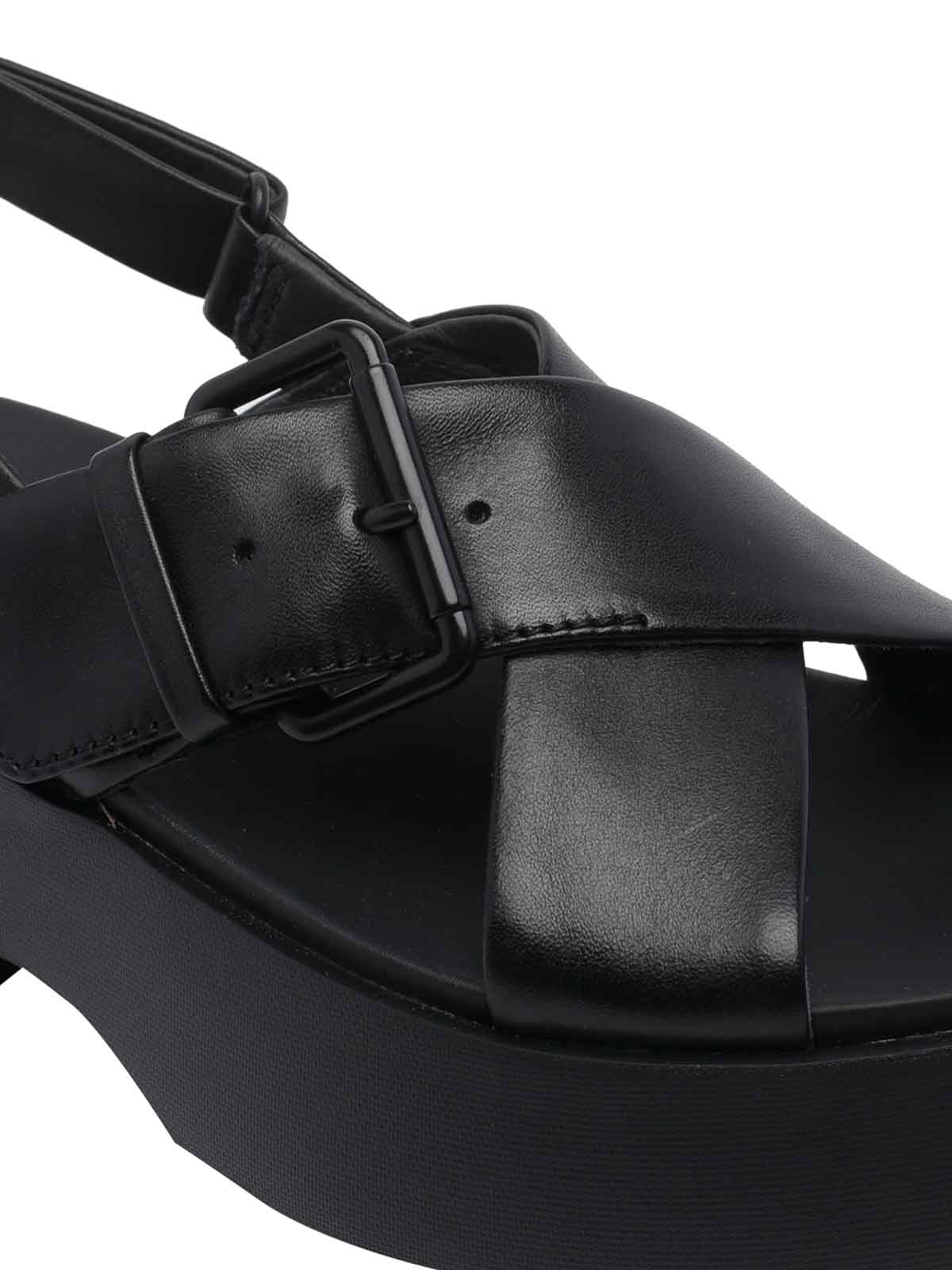 キャンパーブラックタシャサンダル、ラウンドトゥ、レザーアッパー、ラテラルバックルクロージャー
