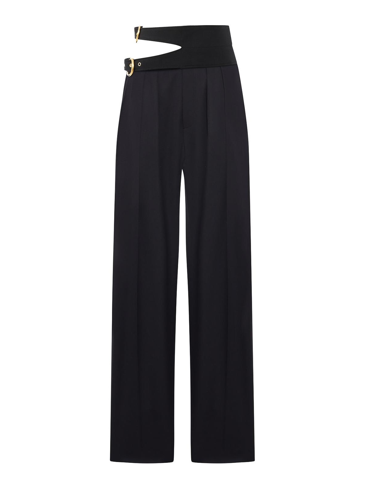 ハイウエストパンツ、フロントジッパーとフッククロージャー、内側に刻印入りホーンボタン、サイドポケット、パイプバックポケット、バックル付きダブルベルト、モデルの身長178cm、サイズ36を着用しています。色:黒