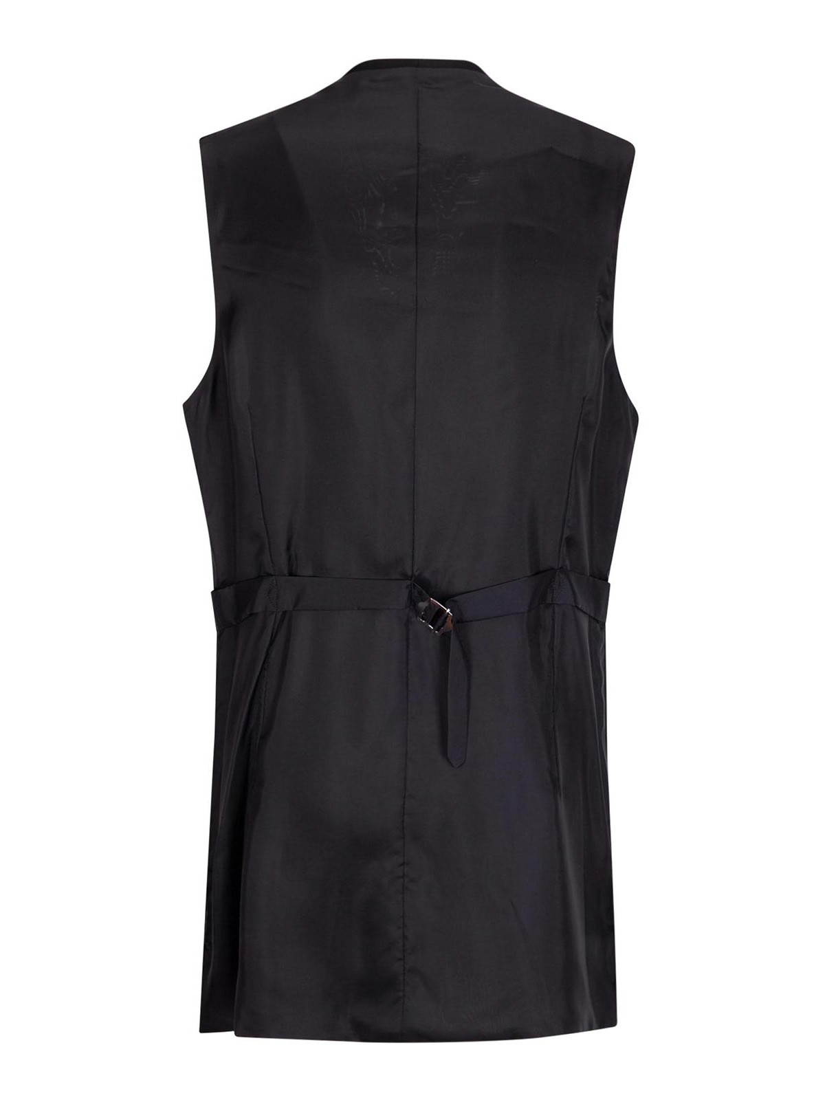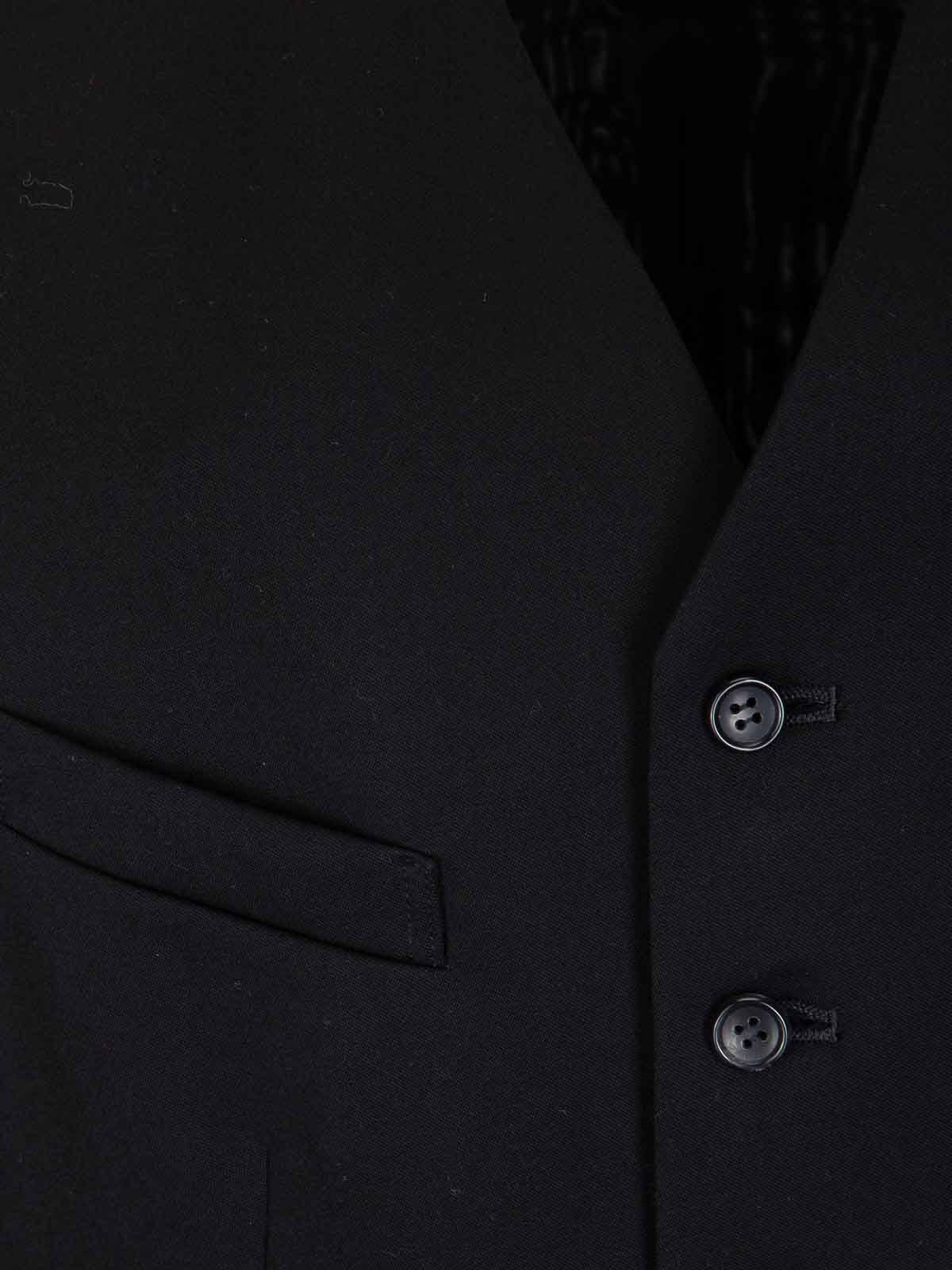 キュプラバック、ブラックボタン、Vネック、フロントポケット4つ付きロングウールベスト。